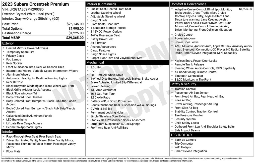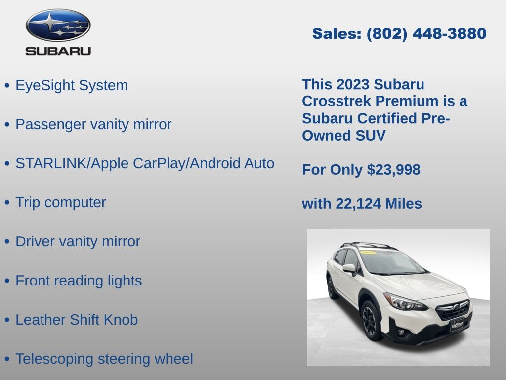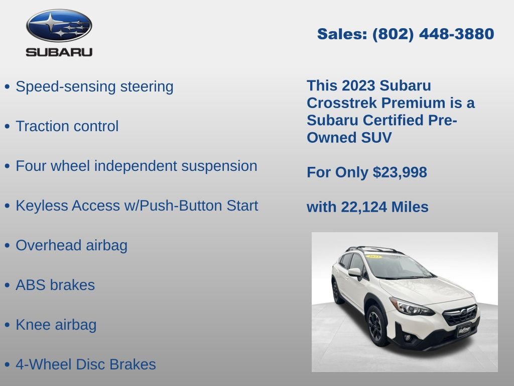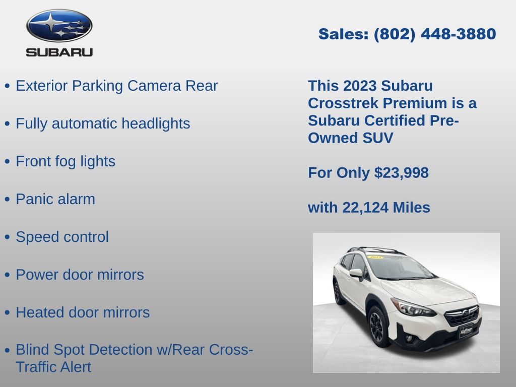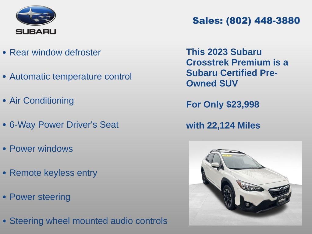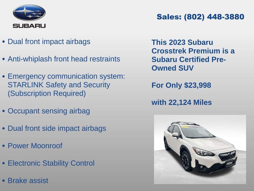CARFAX One-Owner. Subaru Crosstrek Premium 2023 Certified. 4-Wheel Disc Brakes, 6-Way Power Driver's Seat, ABS brakes, Air Conditioning, Alloy wheels, Anti-whiplash front head restraints, Automatic temperature control, Blind Spot Detection w/Rear Cross-Traffic Alert, Brake assist, CD player, Driver vanity mirror, Dual front impact airbags, Dual front side impact airbags, Electronic Stability Control, Emergency communication system: STARLINK Safety and Security (Subscription Required), Exterior Parking Camera Rear, EyeSight System, Four wheel independent suspension, Front fog lights, Front reading lights, Fully automatic headlights, Heated door mirrors, Heated Front Bucket Seats, Illuminated entry, Keyless Access w/Push-Button Start, Knee airbag, Leather Shift Knob, Moonroof & BSD w/RCTA & Power Driver Seat, Occupant sensing airbag, Outside temperature display, Overhead airbag, Overhead console, Panic alarm, Passenger vanity mirror, Power door mirrors, Power Moonroof, Power steering, Power windows, Radio: Subaru STARLINK 6.5" Multimedia Plus System, Rear window defroster, Rear window wiper, Remote keyless entry, Speed control, Speed-sensing steering, Split folding rear seat, STARLINK/Apple CarPlay/Android Auto, Steering wheel mounted audio controls, Tachometer, Telescoping steering wheel, Tilt steering wheel, Traction control, Trip computer, Variably intermittent wipers. Odometer is 9171 miles below market average!