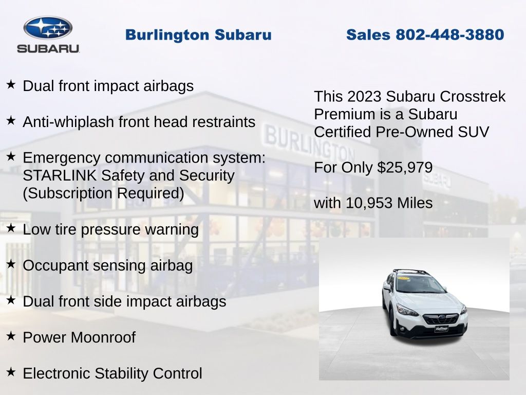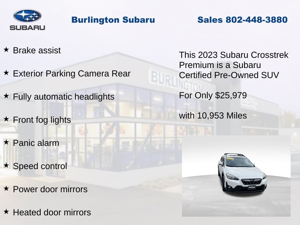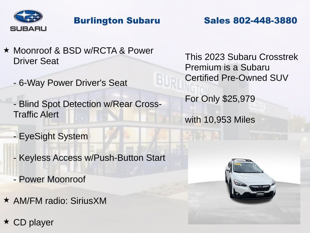 CARFAX One-Owner. Clean CARFAX. Subaru Crosstrek Premium 2023 Certified. 4-Wheel Disc Brakes, 6-Way Power Driver's Seat, ABS brakes, Air Conditioning, Alloy wheels, AM/FM radio: SiriusXM, Anti-whiplash front head restraints, Automatic temperature control, Blind Spot Detection w/Rear Cross-Traffic Alert, Brake assist, CD player, Driver vanity mirror, Dual front impact airbags, Dual front side impact airbags, Electronic Stability Control, Emergency communication system: STARLINK Safety and Security (Subscription Required), Exterior Parking Camera Rear, EyeSight System, Four wheel independent suspension, Front fog lights, Front reading lights, Fully automatic headlights, Heated door mirrors, Heated Front Bucket Seats, Illuminated entry, Keyless Access w/Push-Button Start, Knee airbag, Leather Shift Knob, Low tire pressure warning, Moonroof & BSD w/RCTA & Power Driver Seat, Occupant sensing airbag, Outside temperature display, Overhead airbag, Panic alarm, Passenger vanity mirror, Power door mirrors, Power Moonroof, Power steering, Power windows, Rear window defroster, Rear window wiper, Remote keyless entry, Speed control, Speed-sensing steering, Split folding rear seat, STARLINK/Apple CarPlay/Android Auto, Steering wheel mounted audio controls, Tachometer, Telescoping steering wheel, Tilt steering wheel, Traction control, Trip computer, Variably intermittent wipers. Odometer is 22772 miles below market average!