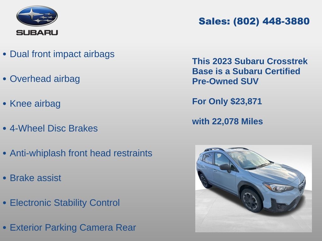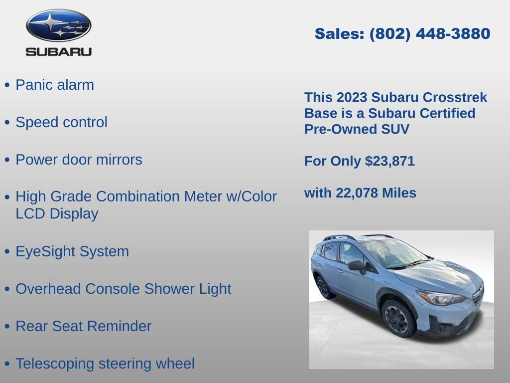 CARFAX One-Owner. Subaru Crosstrek 2023 Certified. 4-Wheel Disc Brakes, ABS brakes, Air Conditioning, Alloy wheels, Anti-whiplash front head restraints, Automatic temperature control, Brake assist, Driver vanity mirror, Dual front impact airbags, Dual front side impact airbags, Electronic Stability Control, Exterior Parking Camera Rear, EyeSight System, Four wheel independent suspension, Front Bucket Seats, Front reading lights, High Grade Combination Meter w/Color LCD Display, Illuminated entry, Knee airbag, Low tire pressure warning, Occupant sensing airbag, Outside temperature display, Overhead airbag, Overhead console, Overhead Console Shower Light, Panic alarm, Passenger vanity mirror, Power door mirrors, Power steering, Power windows, Radio: Subaru STARLINK 6.5" Multimedia System, Rear Seat Reminder, Rear window defroster, Rear window wiper, Remote keyless entry, Speed control, Speed-sensing steering, Split folding rear seat, STARLINK/Apple CarPlay/Android Auto, Steering wheel mounted audio controls, Tachometer, Telescoping steering wheel, Tilt steering wheel, Tire Pressure Monitoring System, Traction control, Trip computer, Variably intermittent wipers. Odometer is 2746 miles below market average!
