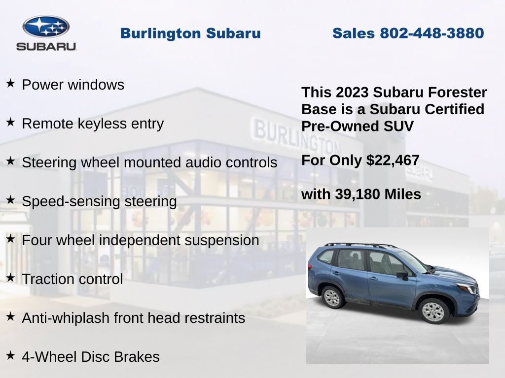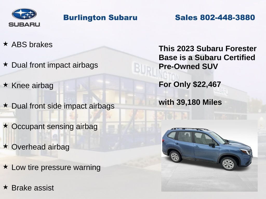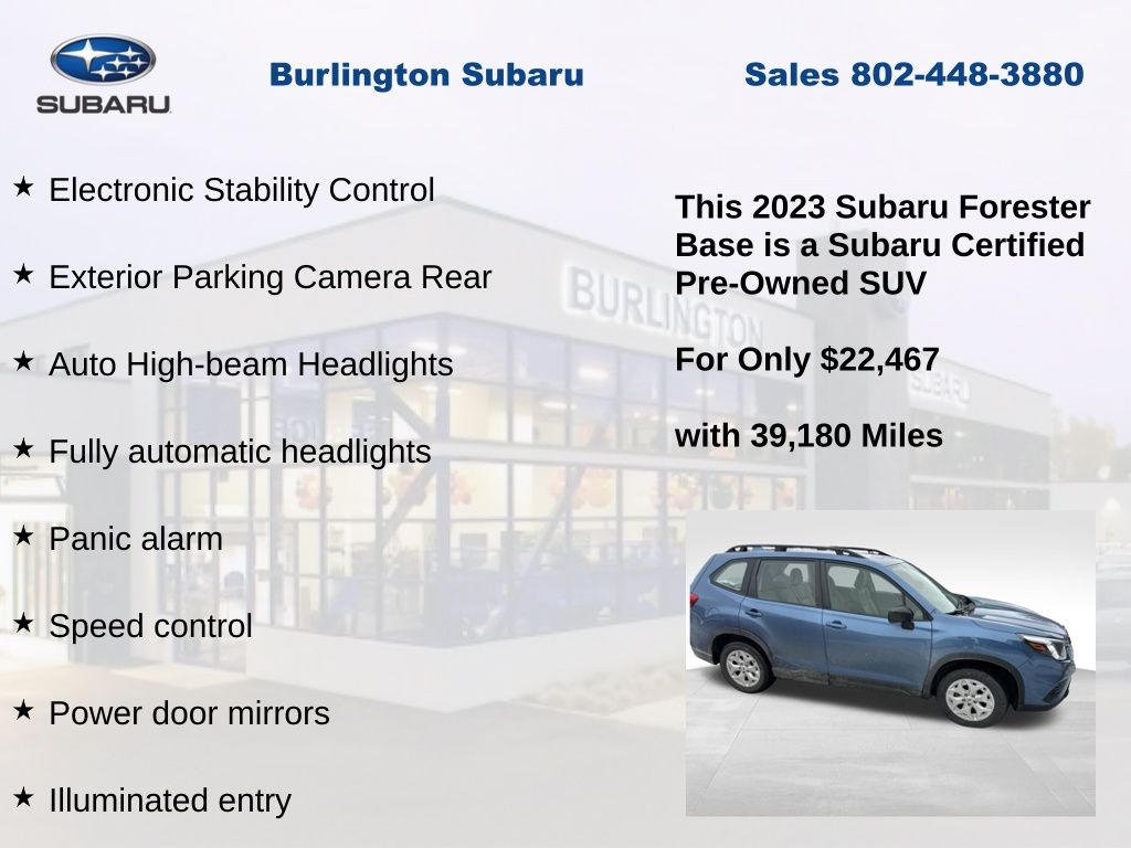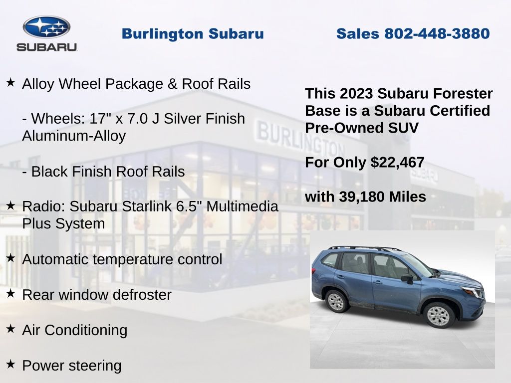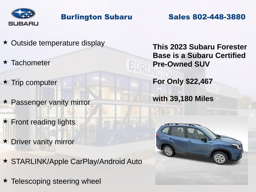 CARFAX One-Owner. Clean CARFAX. Subaru Forester 2023 Certified. 4-Wheel Disc Brakes, ABS brakes, Air Conditioning, Alloy Wheel Package & Roof Rails, Anti-whiplash front head restraints, Auto High-beam Headlights, Automatic temperature control, Black Finish Roof Rails, Brake assist, Driver vanity mirror, Dual front impact airbags, Dual front side impact airbags, Electronic Stability Control, Exterior Parking Camera Rear, Four wheel independent suspension, Front Bucket Seats, Front reading lights, Fully automatic headlights, Illuminated entry, Knee airbag, Low tire pressure warning, Occupant sensing airbag, Outside temperature display, Overhead airbag, Panic alarm, Passenger vanity mirror, Power door mirrors, Power steering, Power windows, Radio: Subaru Starlink 6.5" Multimedia Plus System, Rear window defroster, Rear window wiper, Remote keyless entry, Speed control, Speed-sensing steering, Split folding rear seat, STARLINK/Apple CarPlay/Android Auto, Steering wheel mounted audio controls, Tachometer, Telescoping steering wheel, Tilt steering wheel, Traction control, Trip computer, Variably intermittent wipers, Wheels: 17" x 7.0 J Silver Finish Aluminum-Alloy.