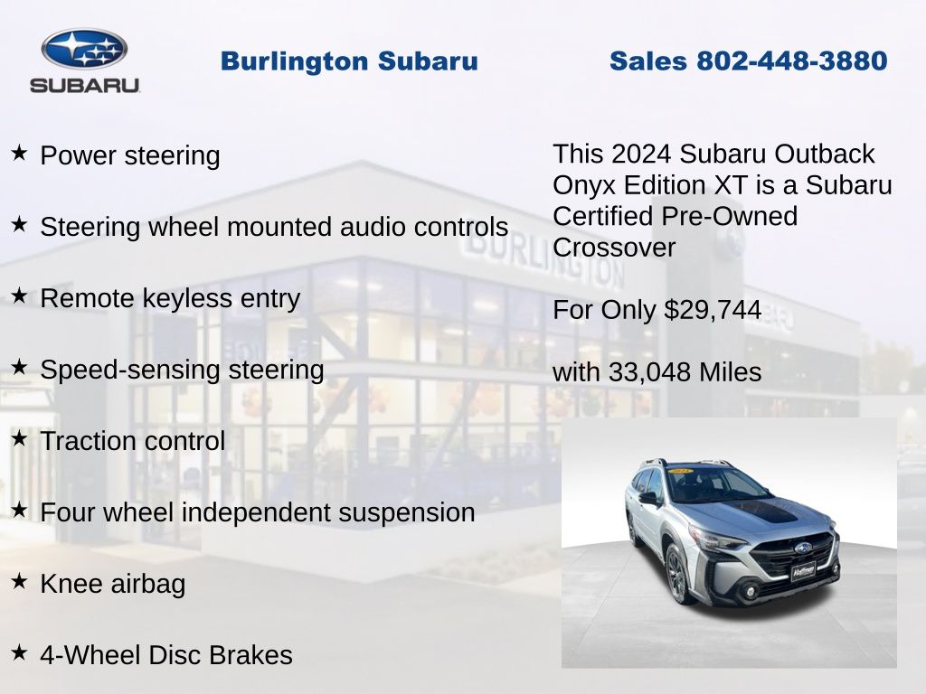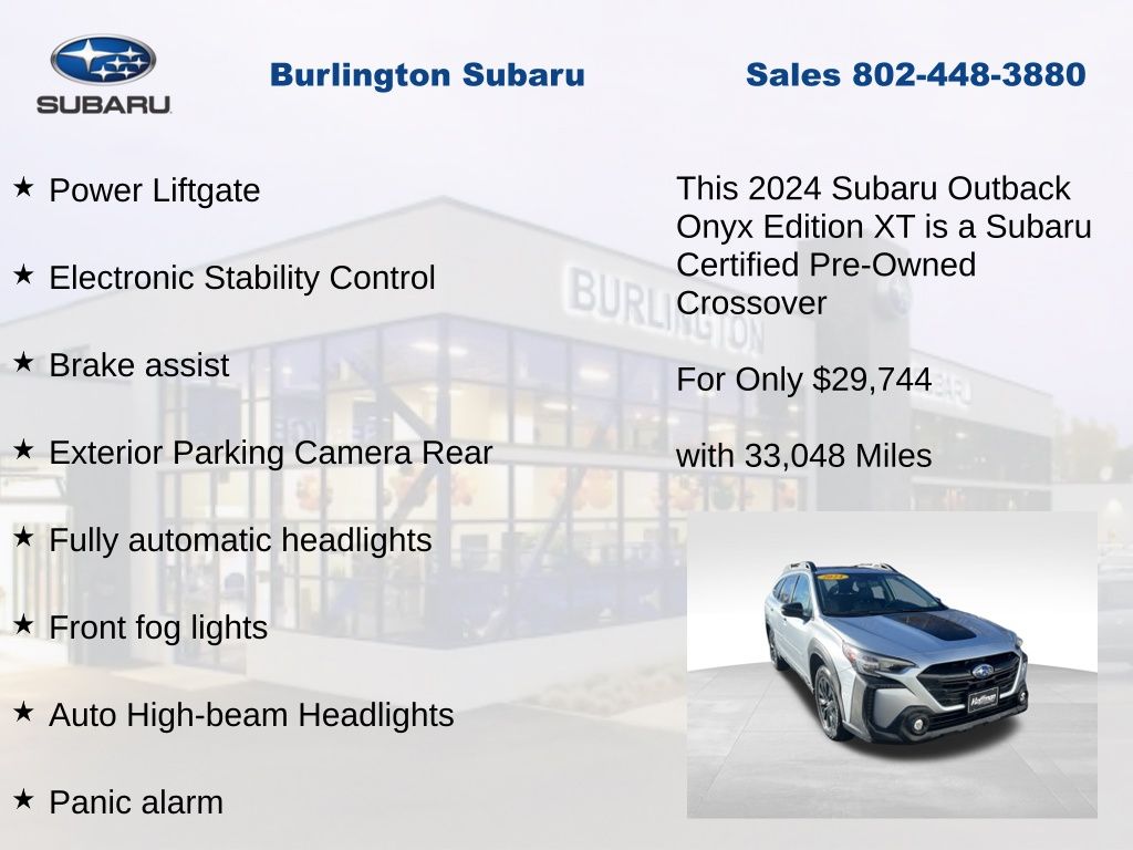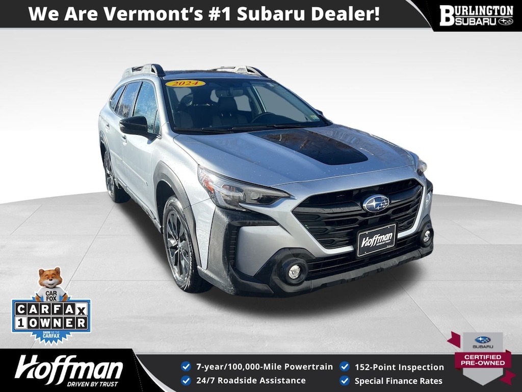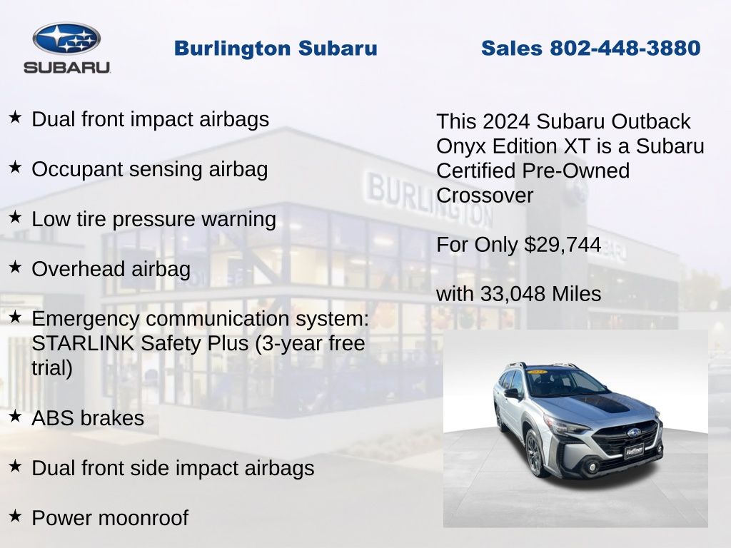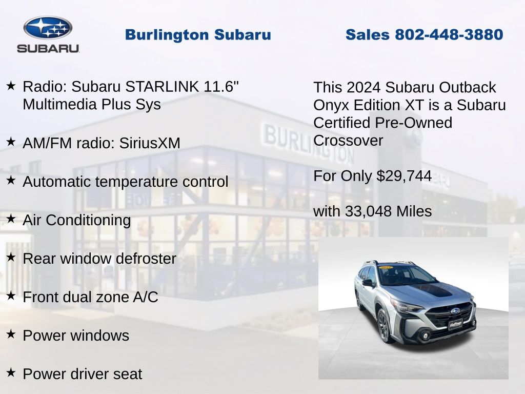 CARFAX One-Owner. Subaru Outback Onyx Edition XT 2024 Certified. 4-Wheel Disc Brakes, ABS brakes, Air Conditioning, Alloy wheels, AM/FM radio: SiriusXM, Auto High-beam Headlights, Auto-dimming Rear-View mirror, Automatic temperature control, Brake assist, Compass, Driver vanity mirror, Dual front impact airbags, Dual front side impact airbags, Electronic Stability Control, Emergency communication system: STARLINK Safety Plus (3-year free trial), Exterior Parking Camera Rear, Four wheel independent suspension, Front dual zone A/C, Front fog lights, Front reading lights, Fully automatic headlights, Garage door transmitter: HomeLink, Heated door mirrors, Heated Front Bucket Seats, Heated rear seats, Heated steering wheel, Illuminated entry, Knee airbag, Leather Shift Knob, Leather steering wheel, Low tire pressure warning, Occupant sensing airbag, Outside temperature display, Overhead airbag, Panic alarm, Passenger vanity mirror, Power door mirrors, Power driver seat, Power Liftgate, Power moonroof, Power passenger seat, Power steering, Power windows, Radio: Subaru STARLINK 11.6" Multimedia Plus Sys, Rear window defroster, Rear window wiper, Remote keyless entry, Speed control, Speed-sensing steering, Split folding rear seat, StarTex-Trimmed Upholstery, Steering wheel mounted audio controls, Tachometer, Telescoping steering wheel, Tilt steering wheel, Traction control, Trip computer, Turn signal indicator mirrors, Variably intermittent wipers.