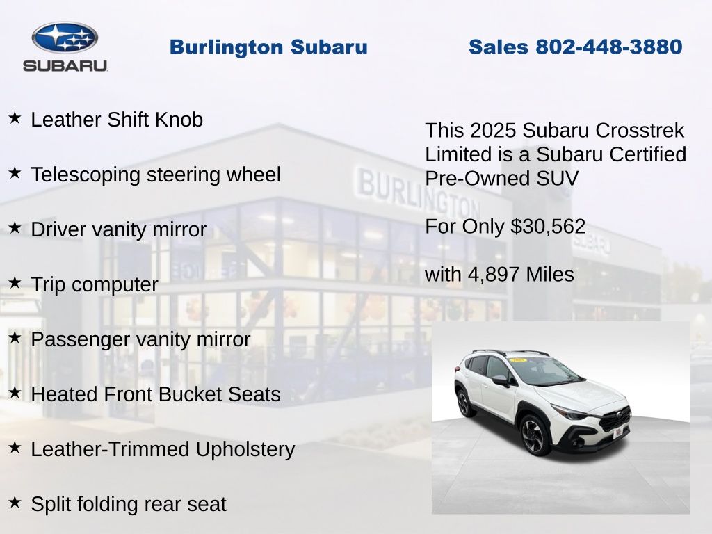 CARFAX One-Owner. Clean CARFAX. Subaru Crosstrek Limited 2025 Certified. 4-Wheel Disc Brakes, ABS brakes, Air Conditioning, Alloy wheels, Anti-whiplash front head restraints, Auto High-beam Headlights, Automatic temperature control, Brake assist, Driver vanity mirror, Dual front impact airbags, Dual front side impact airbags, Electronic Stability Control, Emergency communication system, Exterior Parking Camera Rear, Four wheel independent suspension, Front dual zone A/C, Front fog lights, Front reading lights, Fully automatic headlights, Heated door mirrors, Heated Front Bucket Seats, Illuminated entry, Knee airbag, Leather Shift Knob, Leather steering wheel, Leather-Trimmed Upholstery, Low tire pressure warning, Occupant sensing airbag, Outside temperature display, Overhead airbag, Panic alarm, Passenger vanity mirror, Power door mirrors, Power driver seat, Power steering, Power windows, Radio: Subaru 11.6" Multimedia Plus System, Rear window defroster, Rear window wiper, Remote keyless entry, Speed control, Speed-sensing steering, Split folding rear seat, Steering wheel mounted audio controls, Tachometer, Telescoping steering wheel, Tilt steering wheel, Traction control, Trip computer, Turn signal indicator mirrors, Variably intermittent wipers. Odometer is 924 miles below market average!