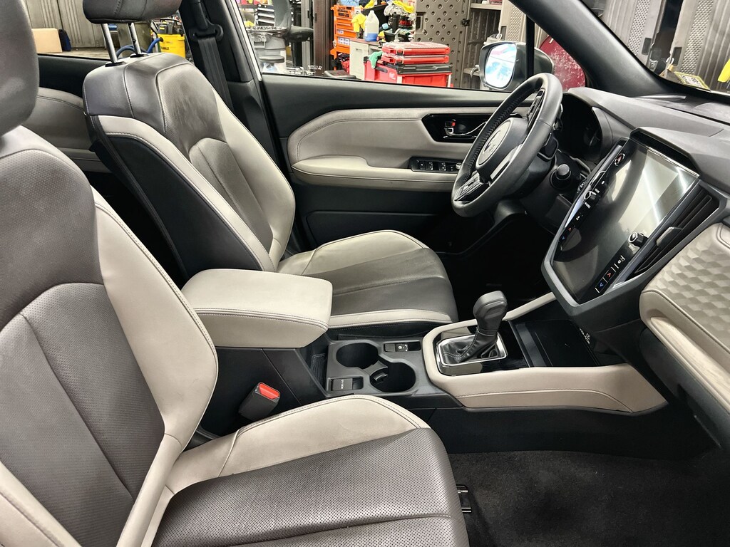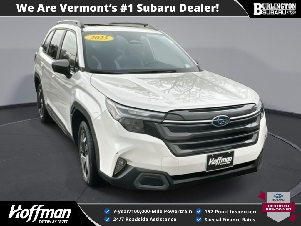 CARFAX One-Owner. Clean CARFAX. Subaru Forester Limited 2025 Certified. 4-Wheel Disc Brakes, ABS brakes, Air Conditioning, Alloy wheels, AM/FM radio: SiriusXM with 360L, Anti-whiplash front head restraints, Auto High-beam Headlights, Automatic temperature control, Brake assist, Driver vanity mirror, Dual front impact airbags, Dual front side impact airbags, Electronic Stability Control, Emergency communication system: MySubaru Safety (3-year free trial), Exterior Parking Camera Rear, Four wheel independent suspension, Front dual zone A/C, Front fog lights, Front reading lights, Fully automatic headlights, Heated door mirrors, Heated Front Bucket Seats, Heated steering wheel, Illuminated entry, Knee airbag, Leather steering wheel, Low tire pressure warning, Occupant sensing airbag, Outside temperature display, Overhead airbag, Overhead console, Panic alarm, Passenger vanity mirror, Perforated Leather-Trimmed Upholstery, Power door mirrors, Power driver seat, Power Liftgate, Power moonroof: Panoramic, Power passenger seat, Power steering, Power windows, Rear window defroster, Rear window wiper, Remote keyless entry, Speed control, Speed-sensing steering, Split folding rear seat, Steering wheel mounted audio controls, Tachometer, Telescoping steering wheel, Tilt steering wheel, Traction control, Trip computer, Turn signal indicator mirrors, Variably intermittent wipers. Odometer is 1384 miles below market average!