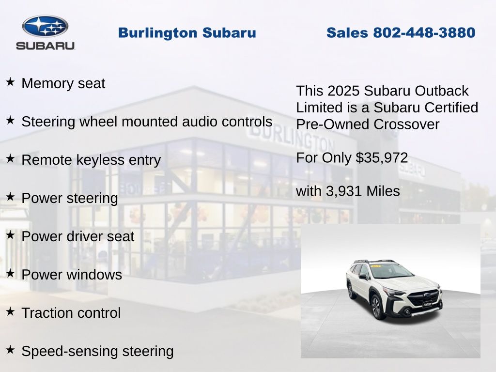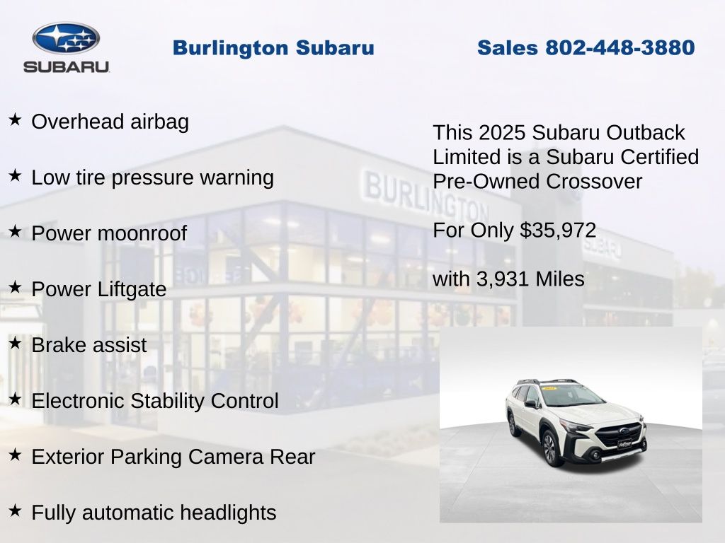 CARFAX One-Owner. Clean CARFAX. Subaru Outback Limited 2025 Certified. 4-Wheel Disc Brakes, ABS brakes, Air Conditioning, Alloy wheels, AM/FM radio: SiriusXM with 360L, Apple CarPlay & Android Auto, Auto High-beam Headlights, Auto-dimming Rear-View mirror, Automatic temperature control, Brake assist, Compass, Driver vanity mirror, Dual front impact airbags, Dual front side impact airbags, Electronic Stability Control, Emergency communication system: MySubaru Safety (3-year free trial), Exterior Parking Camera Rear, Four wheel independent suspension, Front dual zone A/C, Front fog lights, Front reading lights, Fully automatic headlights, Garage door transmitter: HomeLink, Heated door mirrors, Heated Front Bucket Seats, Heated steering wheel, HVAC memory, Illuminated entry, Knee airbag, Leather Shift Knob, Leather steering wheel, Low tire pressure warning, Memory seat, Navigation system: TomTom Navigation w/what3words, Occupant sensing airbag, Outside temperature display, Overhead airbag, Panic alarm, Passenger vanity mirror, Perforated Leather-Trimmed Upholstery, Power driver seat, Power Liftgate, Power moonroof, Power passenger seat, Power steering, Power windows, Radio: Subaru 11.6" Multimedia System w/Navigation, Rear window defroster, Rear window wiper, Remote keyless entry, Speed control, Speed-sensing steering, Split folding rear seat, Steering wheel mounted audio controls, Tachometer, Telescoping steering wheel, Tilt steering wheel, Traction control, Trip computer, Turn signal indicator mirrors, Variably intermittent wipers. Odometer is 3080 miles below market average!