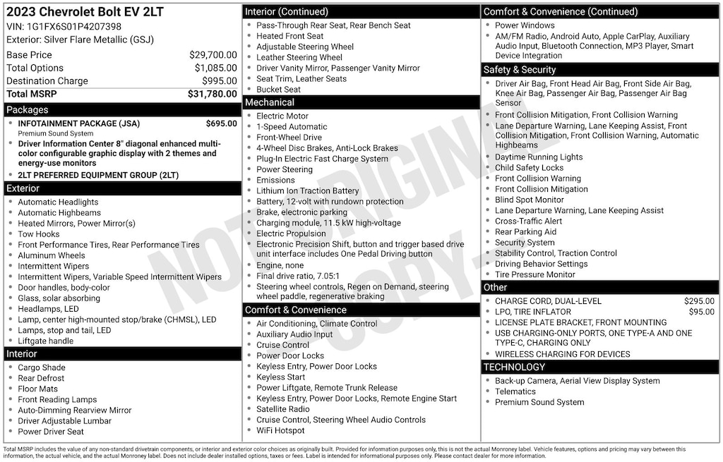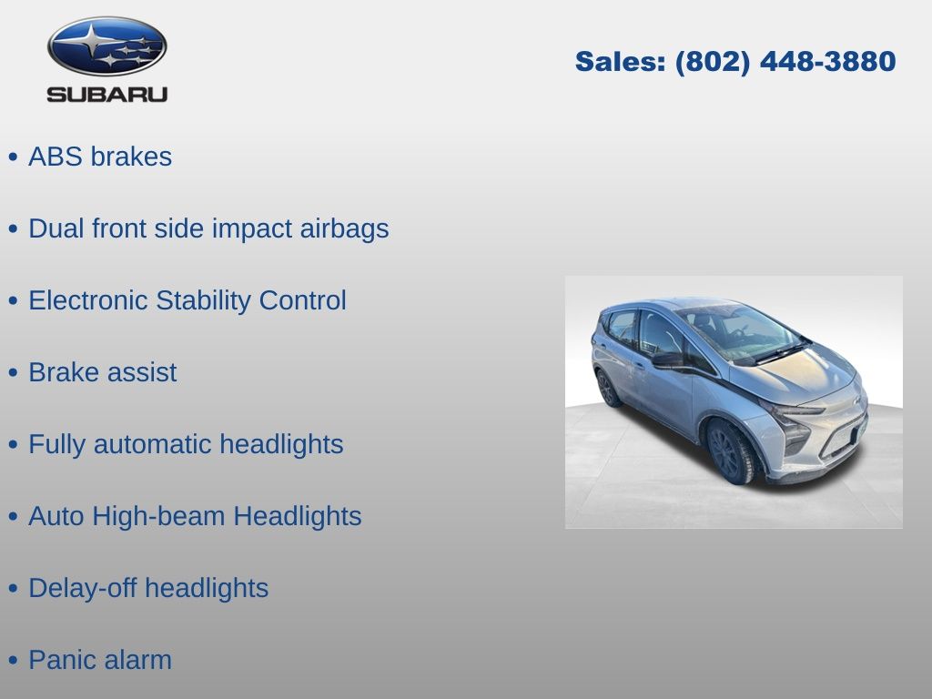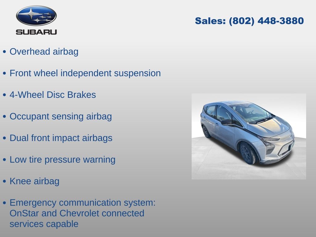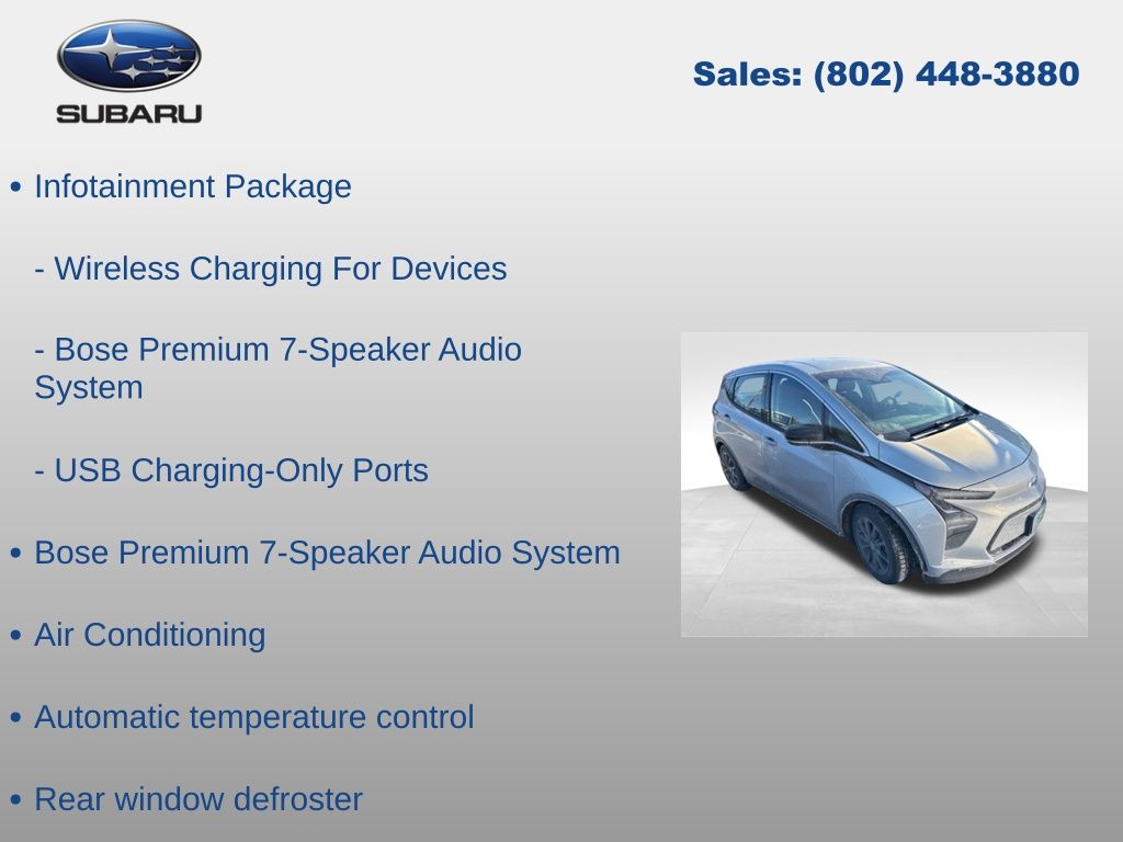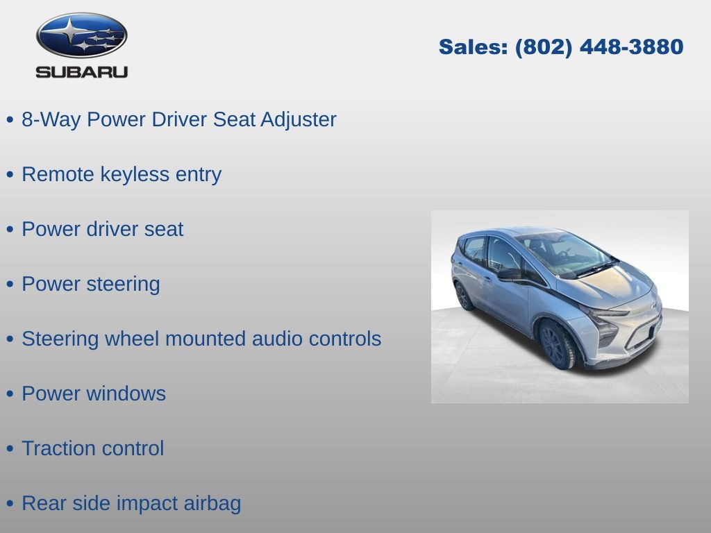 CARFAX One-Owner. Clean CARFAX. Chevrolet Bolt EV 2LT 2023 2-Way Power Driver Lumbar Seat Adjuster, 4-Wheel Disc Brakes, 6-Way Manual Passenger Seat Adjuster, 8-Way Power Driver Seat Adjuster, ABS brakes, Air Conditioning, Alloy wheels, Apple CarPlay/Android Auto, Auto High-beam Headlights, Auto-dimming Rear-View mirror, Automatic temperature control, Bose Premium 7-Speaker Audio System, Brake assist, Compass, Delay-off headlights, Driver vanity mirror, Dual front impact airbags, Dual front side impact airbags, Dual-Level Charge Cord, Electronic Stability Control, Emergency communication system: OnStar and Chevrolet connected services capable, Front Bucket Seats, Front reading lights, Front wheel independent suspension, Fully automatic headlights, Heated door mirrors, Heated Driver & Front Passenger Seats, Heated front seats, Heated steering wheel, Illuminated entry, Infotainment Package, Knee airbag, Leather steering wheel, Low tire pressure warning, Occupant sensing airbag, Overhead airbag, Overhead console, Panic alarm, Passenger vanity mirror, Perforated Leather-Appointed Seat Trim, Power door mirrors, Power driver seat, Power steering, Power windows, Rear side impact airbag, Rear window defroster, Rear window wiper, Remote keyless entry, Speed control, Split folding rear seat, Sport steering wheel, Steering wheel mounted audio controls, Telescoping steering wheel, Tilt steering wheel, Traction control, Trip computer, Turn signal indicator mirrors, USB Charging-Only Ports, Variably intermittent wipers, Wireless Charging For Devices. Odometer is 11145 miles below market average!