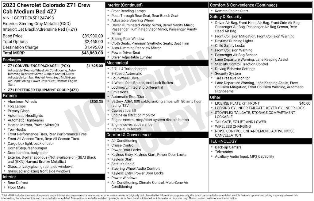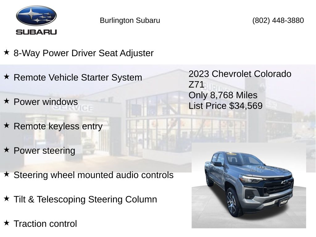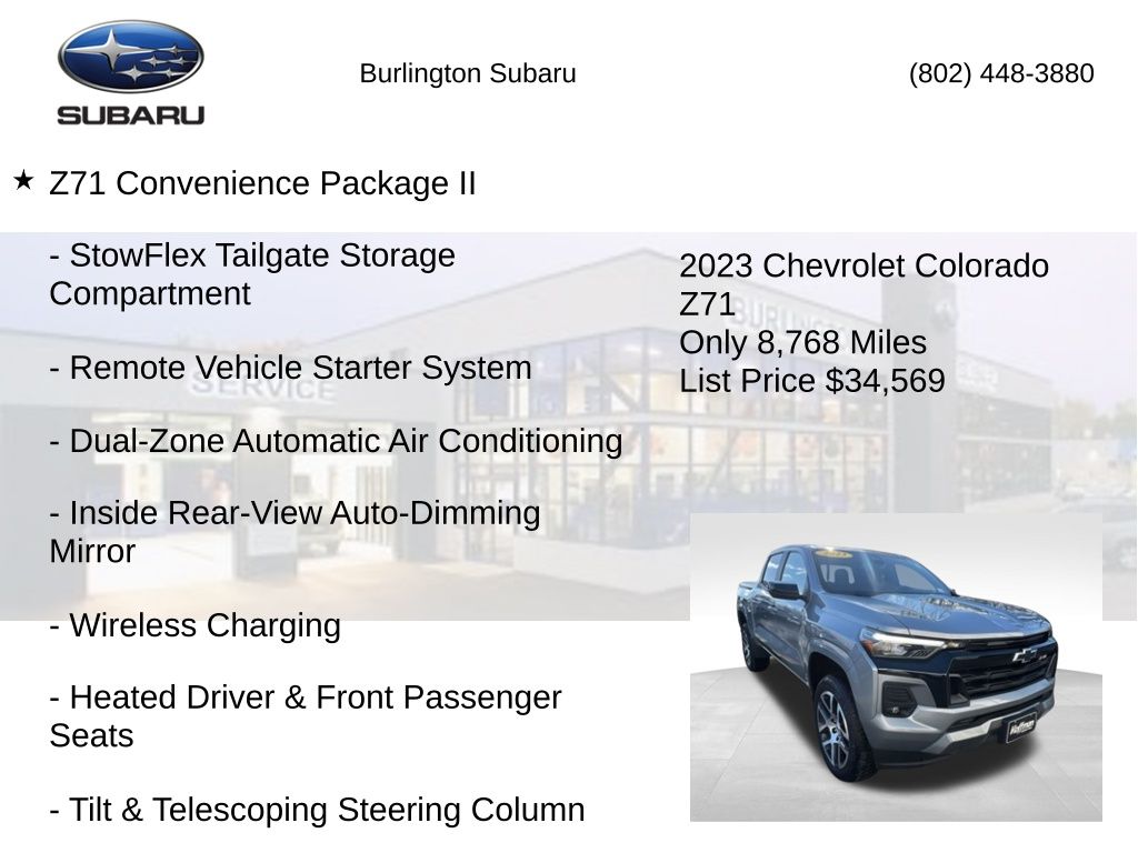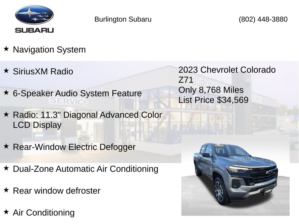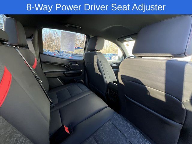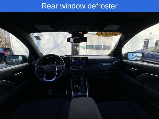 Clean CARFAX. Chevrolet Colorado Z71 2023 4-Way Manual Passenger Seat Adjuster, 4-Wheel Disc Brakes, 6-Speaker Audio System Feature, 6-Way Manual Driver Seat Adjuster, 8-Way Power Driver Seat Adjuster, ABS brakes, Air Conditioning, Alloy wheels, Apple CarPlay/Android Auto, Auto High-beam Headlights, Automatic Emergency Braking, Brake assist, Chevy Safety Assist, Compass, Delay-off headlights, Driver vanity mirror, Dual front impact airbags, Dual front side impact airbags, Dual-Zone Automatic Air Conditioning, Electronic Automatic Cruise Control, Electronic Stability Control, EZ-Lift & Lower Tailgate, Following Distance Indicator, Forward Collision Alert, Front anti-roll bar, Front Bucket Seats, Front fog lights, Front Pedestrian & Bicyclist Braking, Front reading lights, Front wheel independent suspension, Heated door mirrors, Heated Driver & Front Passenger Seats, Illuminated entry, Inside Rear-View Auto-Dimming Mirror, IntelliBeam Automatic High Beam On/Off, Lane Keep Assist w/Lane Departure Warning, Low tire pressure warning, Navigation System, Occupant sensing airbag, Outside temperature display, Overhead airbag, Overhead console, Panic alarm, Passenger vanity mirror, Power door mirrors, Power Driver Lumbar Control Seat Adjuster, Power steering, Power windows, Preferred Equipment Group 4Z7, Radio: 11.3" Diagonal Advanced Color LCD Display, Rear reading lights, Rear window defroster, Rear-Window Electric Defogger, Remote keyless entry, Remote Vehicle Starter System, SiriusXM Radio, Speed control, Speed-sensing steering, Steering Wheel Mounted Audio Controls, Steering wheel mounted audio controls, StowFlex Tailgate Storage Compartment, Tachometer, Tailgate Keyed Cylinder Lock, Tilt & Telescoping Steering Column, Tilt steering wheel, Traction control, Trip computer, Variably intermittent wipers, Wheels: 20" x 9" Dark Android Aluminum, Wireless Charging, Wireless Phone Projection, Z71 Convenience Package II. Odometer is 20059 miles below market average!