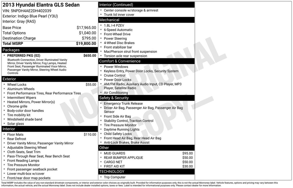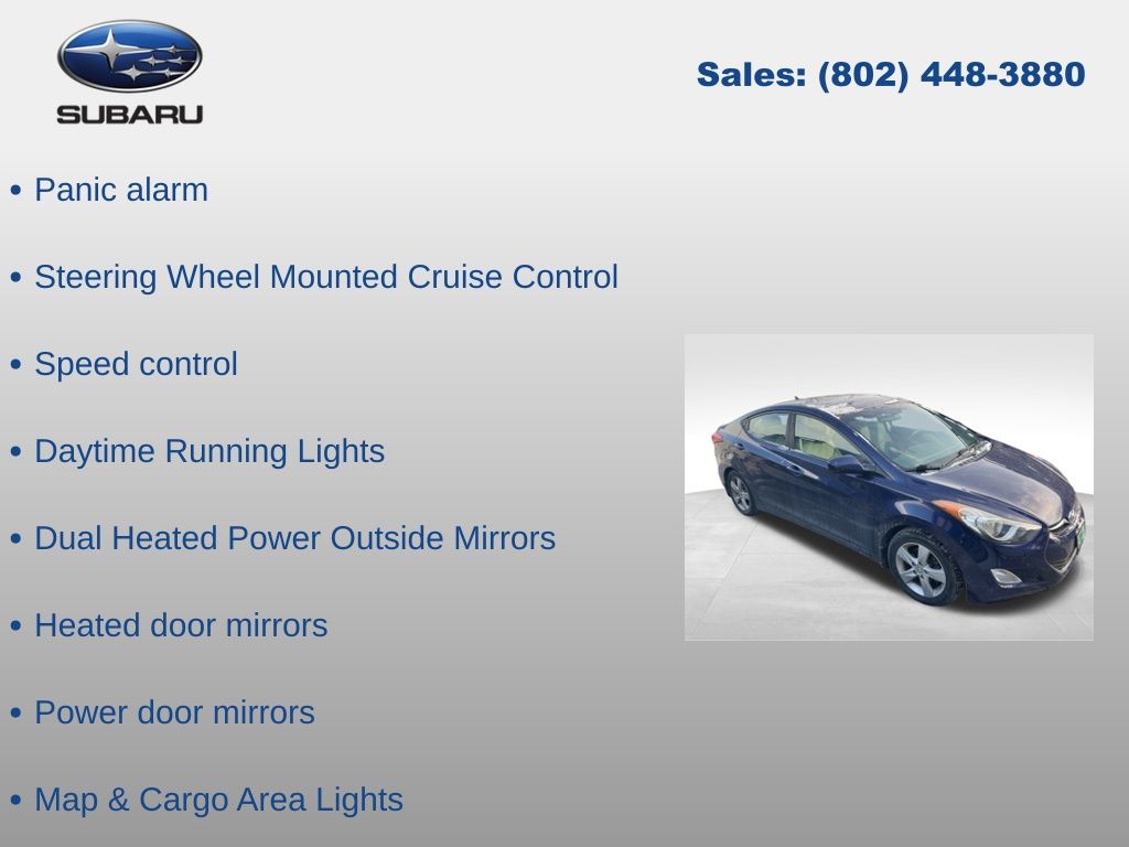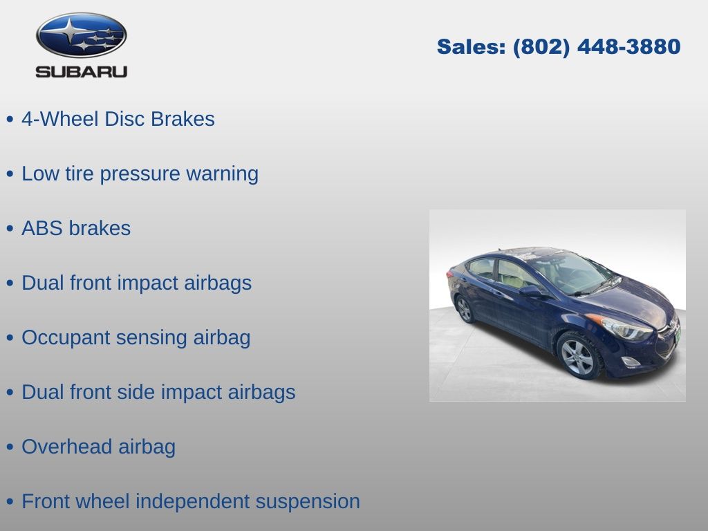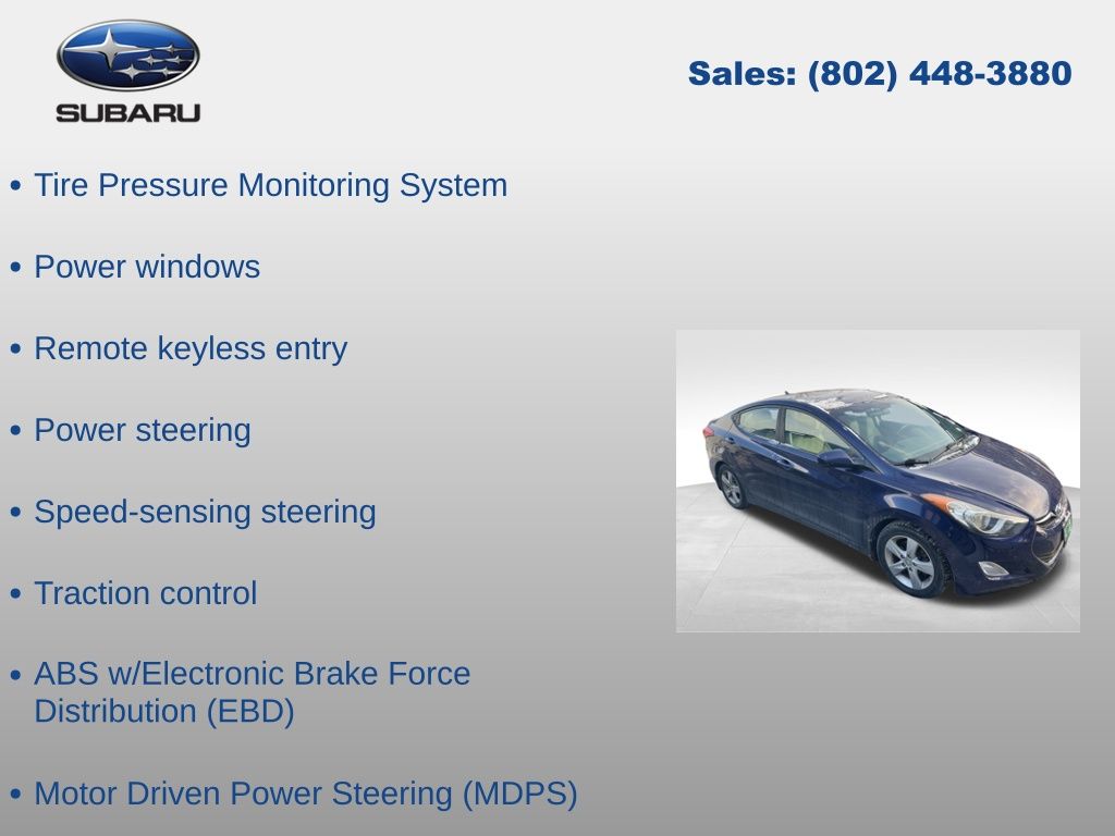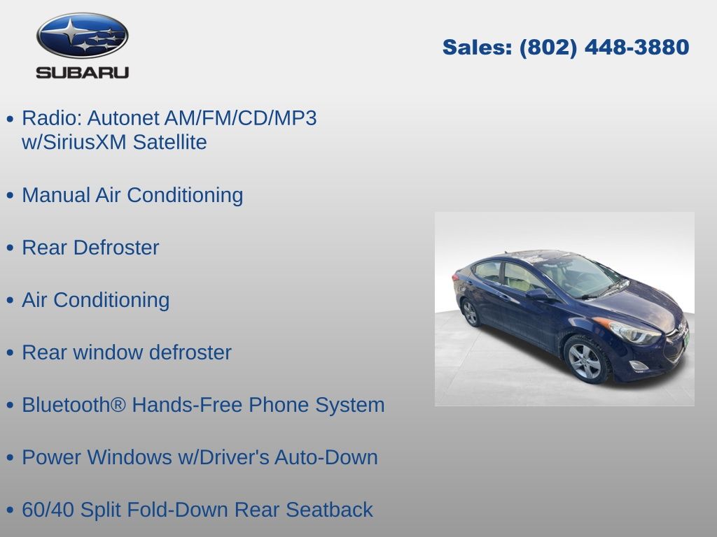 CARFAX One-Owner. Clean CARFAX. Hyundai Elantra GLS 2013 4-Wheel Disc Brakes, 60/40 Split Fold-Down Rear Seatback, ABS brakes, ABS w/Electronic Brake Force Distribution (EBD), Advanced Dual Front Airbags, Air Conditioning, Alloy wheels, Bluetooth® Hands-Free Phone System, Brake assist, Daytime Running Lights, Delay-off headlights, Dual front impact airbags, Dual front side impact airbags, Dual Heated Power Outside Mirrors, Electronic Stability Control, Front 2-Speed Intermittent Wipers, Front Fog Lights, Front reading lights, Front wheel independent suspension, Heated door mirrors, Heated Front Bucket Seats, Illuminated entry, Illuminated Vanity Mirrors w/Extensions, Low tire pressure warning, Manual Air Conditioning, Map & Cargo Area Lights, Motor Driven Power Steering (MDPS), Occupant sensing airbag, Outside temperature display, Overhead airbag, Panic alarm, Passenger vanity mirror, Power door mirrors, Power steering, Power windows, Power Windows w/Driver's Auto-Down, Premium Cloth Seating Surfaces, Radio: Autonet AM/FM/CD/MP3 w/SiriusXM Satellite, Rear Defroster, Rear window defroster, Remote keyless entry, Remote Keyless Entry System w/Alarm, Speed control, Speed-sensing steering, Split folding rear seat, Steering Wheel Mounted Cruise Control, Tachometer, Telescopic Steering Wheel, Telescoping steering wheel, Tilt Steering Wheel, Tilt steering wheel, Tire Pressure Monitoring System, Traction control, Traction Control System, Trip Computer, Trip computer, Variably intermittent wipers, Vehicle Stability Management. Odometer is 60904 miles below market average!