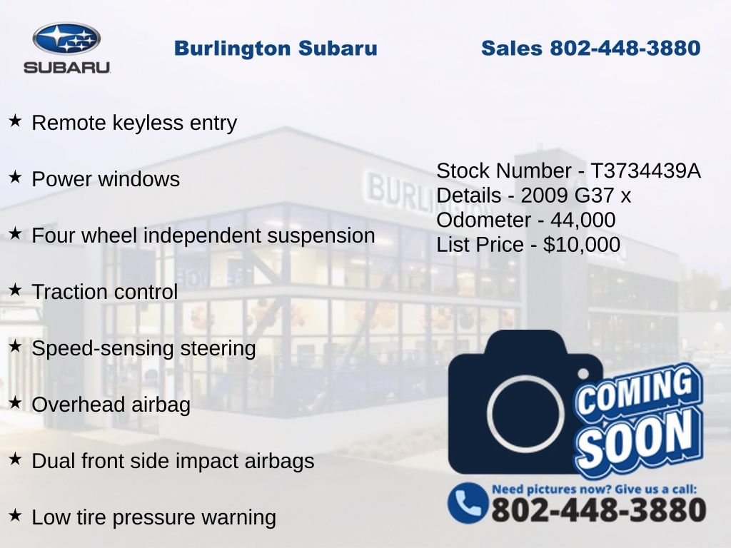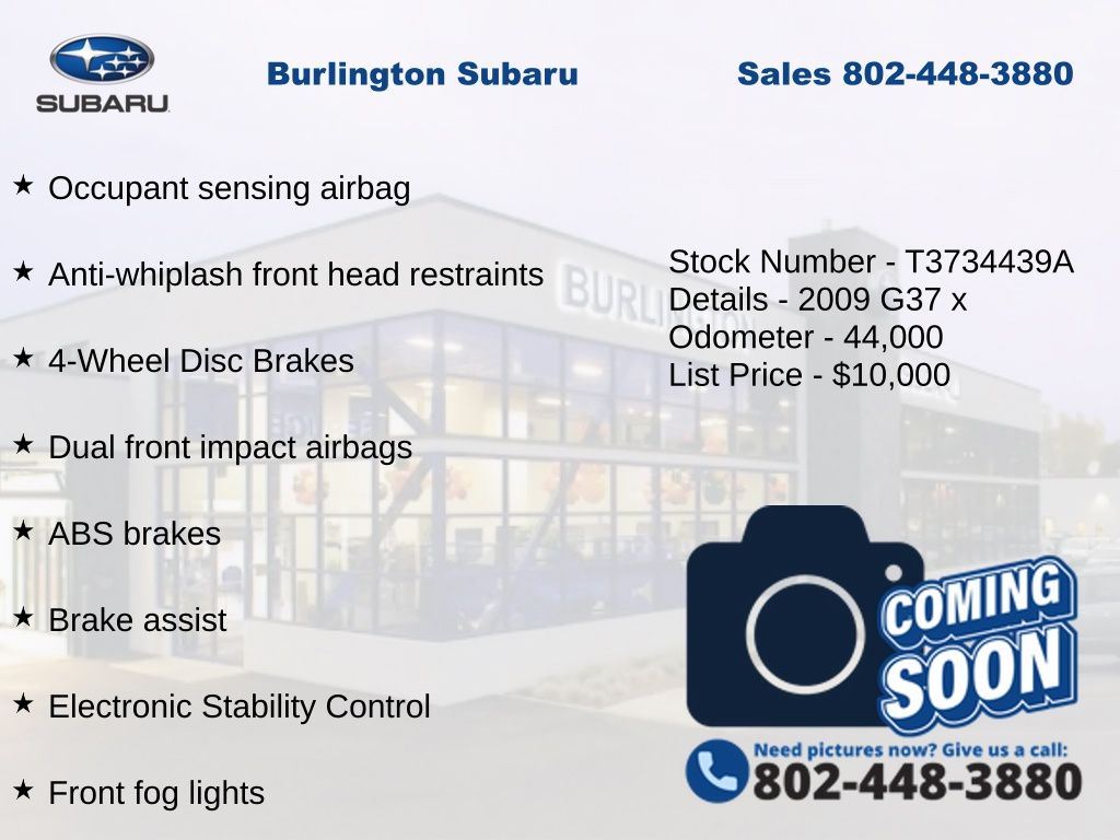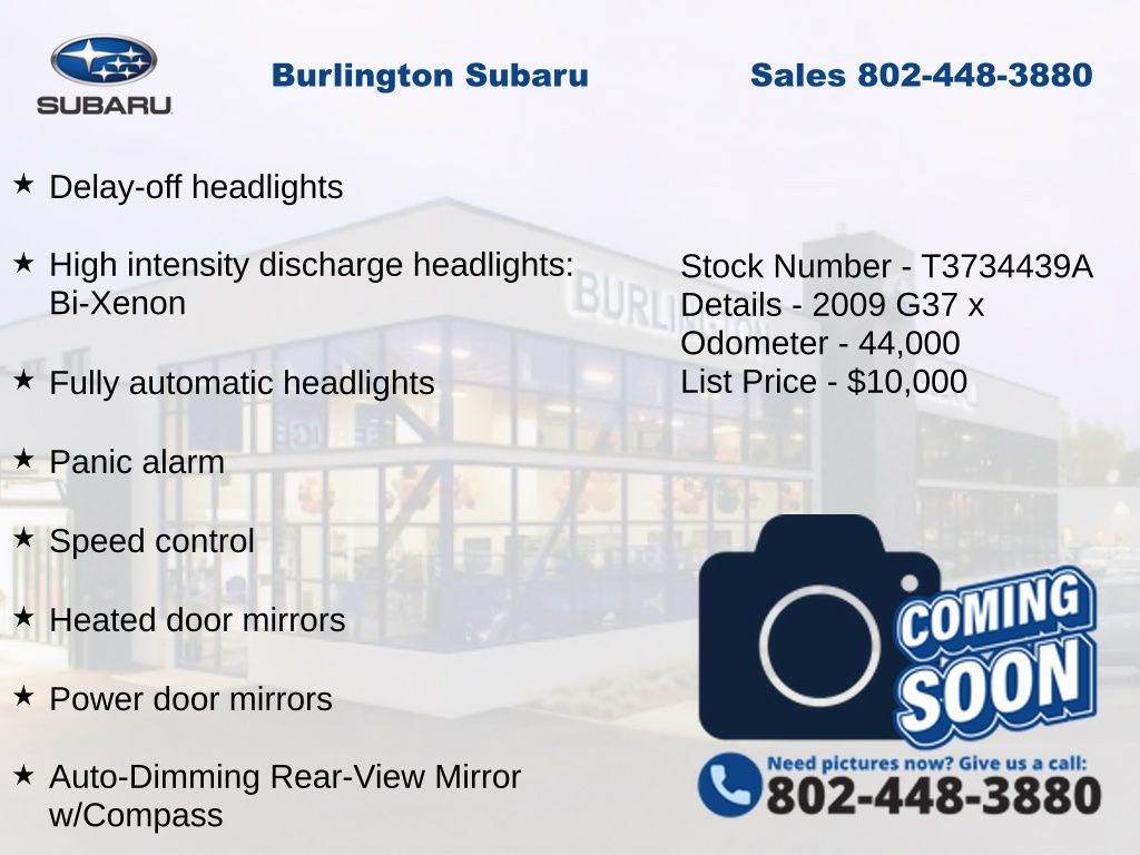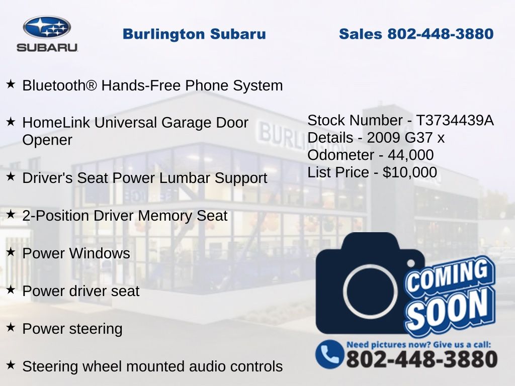 CARFAX One-Owner. INFINITI G37 X 2009 2-Position Driver Memory Seat, 4-Wheel Disc Brakes, ABS brakes, Air Conditioning, Alloy wheels, AM/FM/6-Disc In Dash CD w/MP3/WMA Playback, Anti-whiplash front head restraints, Auto-Dimming Rear-View Mirror w/Compass, Automatic temperature control, Bluetooth® Hands-Free Phone System, Brake assist, Delay-off headlights, Driver vanity mirror, Driver's Seat Power Lumbar Support, Dual front impact airbags, Dual front side impact airbags, Electronic Stability Control, Four wheel independent suspension, Front dual zone A/C, Front fog lights, Front reading lights, Fully automatic headlights, Heated door mirrors, Heated Front Bucket Seats, High intensity discharge headlights: Bi-Xenon, HomeLink Universal Garage Door Opener, Illuminated entry, iPod Connectivity, Leather Appointed Seat Trim, Leather Shift Knob, Leather steering wheel, Low tire pressure warning, Moonroof Package, Occupant sensing airbag, Outside temperature display, Overhead airbag, Panic alarm, Passenger vanity mirror, Power door mirrors, Power driver seat, Power passenger seat, Power steering, Power Tilt & Telescopic Steering Wheel, Power Windows, Power windows, Radio data system, Rear reading lights, Rear window defroster, Remote keyless entry, Speed control, Speed-sensing steering, Speed-Sensitive Wipers, Steering wheel mounted audio controls, Tachometer, Telescoping steering wheel, Tilt steering wheel, Traction control, Trip computer, Variably intermittent wipers. Odometer is 94621 miles below market average!