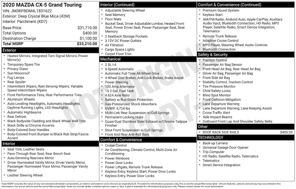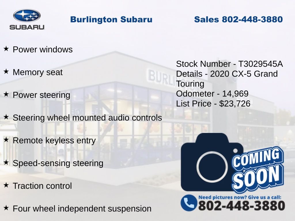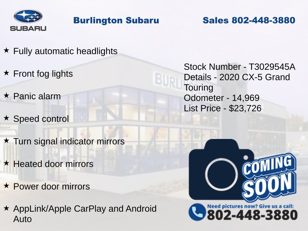 Clean CARFAX. Mazda CX-5 Grand Touring 2020 4-Wheel Disc Brakes, ABS brakes, Air Conditioning, Alloy wheels, AM/FM radio: SiriusXM, AppLink/Apple CarPlay and Android Auto, Auto High-beam Headlights, Auto-dimming Rear-View mirror, Automatic temperature control, Bose 10-Speaker Audio Sound System, Brake assist, Delay-off headlights, Driver vanity mirror, Dual front impact airbags, Dual front side impact airbags, Electronic Stability Control, Emergency communication system, Exterior Parking Camera Rear, Four wheel independent suspension, Front dual zone A/C, Front fog lights, Front reading lights, Fully automatic headlights, Garage door transmitter: HomeLink, Heated door mirrors, Heated Front Sport Seats, Illuminated entry, Lane Departure Warning System, Leather Shift Knob, Low tire pressure warning, Memory seat, Occupant sensing airbag, Outside temperature display, Overhead airbag, Panic alarm, Passenger vanity mirror, Power door mirrors, Power driver seat, Power Liftgate, Power moonroof, Power passenger seat, Power steering, Power windows, Radio: AM/FM/HD Audio System, Rain sensing wipers, Rear reading lights, Rear window defroster, Rear window wiper, Remote keyless entry, Speed control, Speed-sensing steering, Steering wheel mounted audio controls, Tachometer, Telescoping steering wheel, Tilt steering wheel, Traction control, Trip computer, Turn signal indicator mirrors, Variably intermittent wipers. Odometer is 51042 miles below market average!