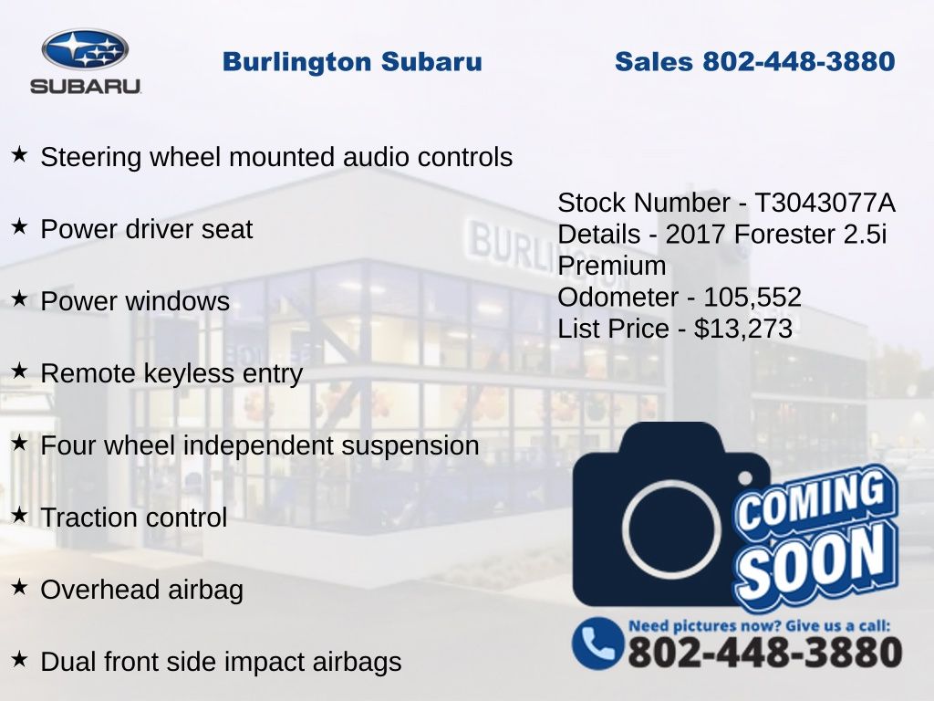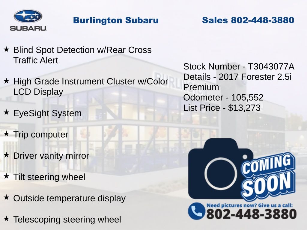 Subaru Forester 2.5i Premium 2017 4-Wheel Disc Brakes, ABS brakes, Air Conditioning, All-Weather Pkg & EyeSight & Blind Spot Detection, Alloy wheels, AM/FM radio: SiriusXM, Automatic temperature control, Blind Spot Detection w/Rear Cross Traffic Alert, Brake assist, CD player, Driver vanity mirror, Dual front impact airbags, Dual front side impact airbags, Electronic Stability Control, Emergency communication system: STARLINK, Exterior Parking Camera Rear, EyeSight System, Four wheel independent suspension, Heated Exterior Mirrors, Heated Front Seats, High Grade Instrument Cluster w/Color LCD Display, Illuminated entry, Knee airbag, Low tire pressure warning, Occupant sensing airbag, Outside temperature display, Overhead airbag, Panic alarm, Passenger vanity mirror, Power door mirrors, Power driver seat, Power moonroof, Power steering, Power windows, Radio: Subaru Starlink 7.0" Multimedia Plus System, Rear window defroster, Rear window wiper, Remote keyless entry, Speed control, Split folding rear seat, Steering Responsive Fog Lights (SRF), Steering wheel mounted audio controls, Tachometer, Telescoping steering wheel, Tilt steering wheel, Traction control, Trip computer, Variably intermittent wipers, Windshield Wiper De-Icer.
