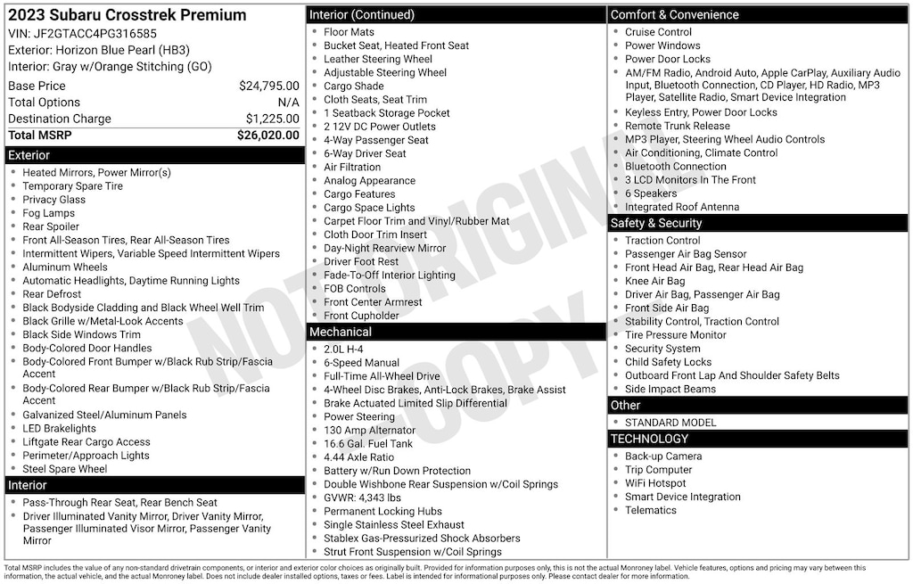 CARFAX One-Owner. Clean CARFAX. Subaru Crosstrek Premium 2023 4-Wheel Disc Brakes, ABS brakes, Air Conditioning, Alloy wheels, AM/FM radio: SiriusXM, Anti-whiplash front head restraints, Automatic temperature control, Brake assist, CD player, Driver vanity mirror, Dual front impact airbags, Dual front side impact airbags, Electronic Stability Control, Emergency communication system: STARLINK Safety and Security (Subscription Required), Exterior Parking Camera Rear, Four wheel independent suspension, Front fog lights, Front reading lights, Fully automatic headlights, Heated door mirrors, Heated Front Bucket Seats, Illuminated entry, Knee airbag, Leather Shift Knob, Low tire pressure warning, Occupant sensing airbag, Outside temperature display, Overhead airbag, Panic alarm, Passenger vanity mirror, Power door mirrors, Power steering, Power windows, Radio: Subaru STARLINK 6.5" Multimedia Plus System, Rear window defroster, Rear window wiper, Remote keyless entry, Speed control, Speed-sensing steering, Split folding rear seat, STARLINK/Apple CarPlay/Android Auto, Steering wheel mounted audio controls, Tachometer, Telescoping steering wheel, Tilt steering wheel, Traction control, Trip computer, Variably intermittent wipers.