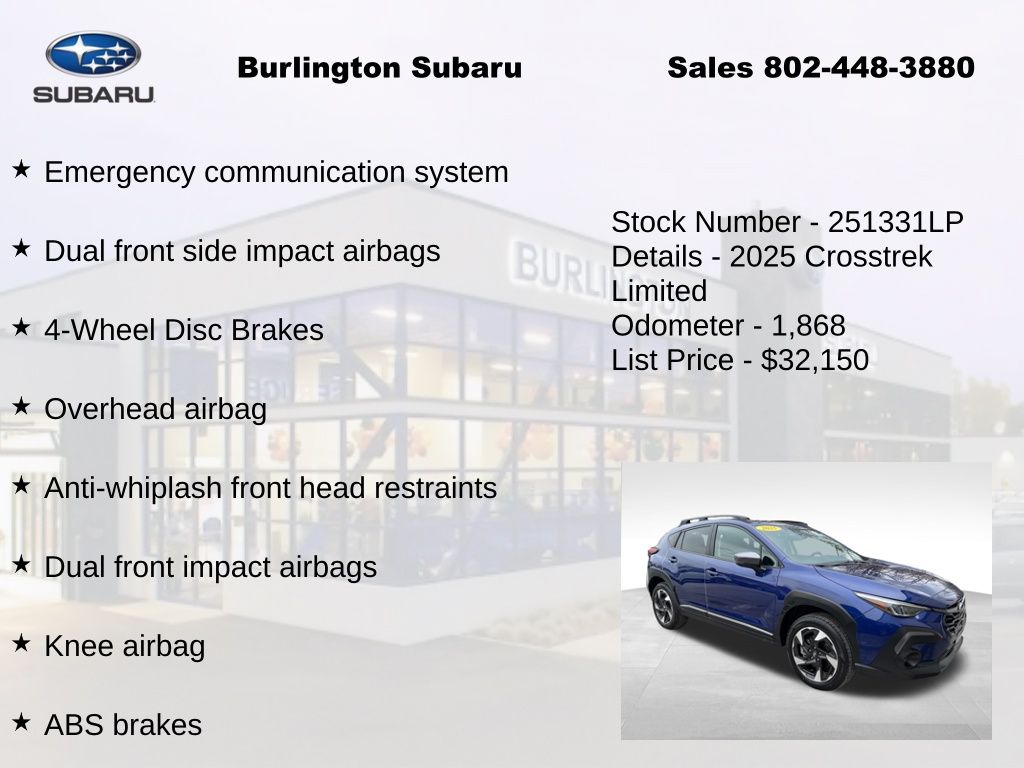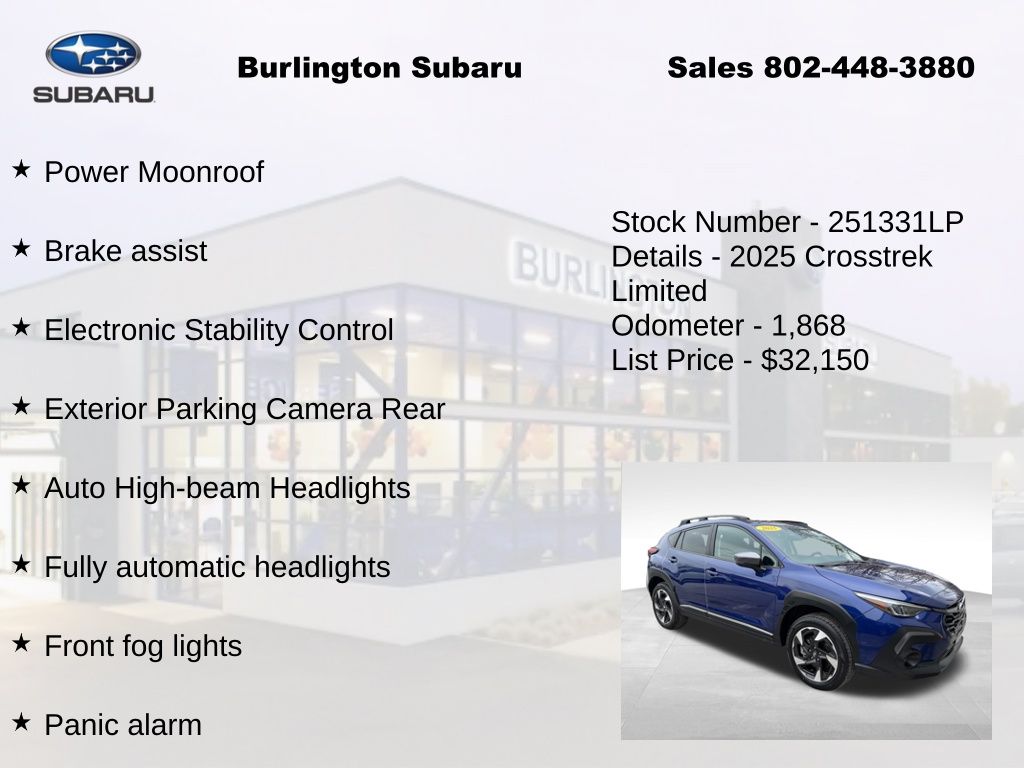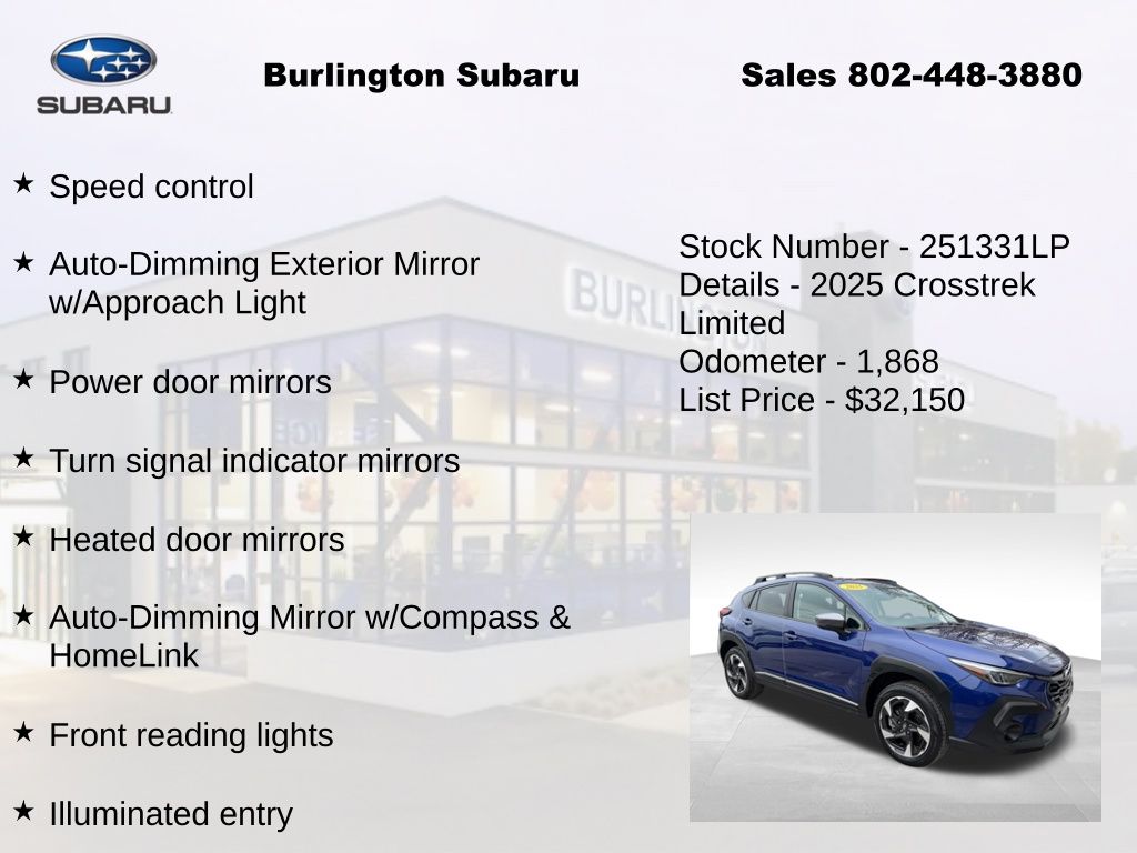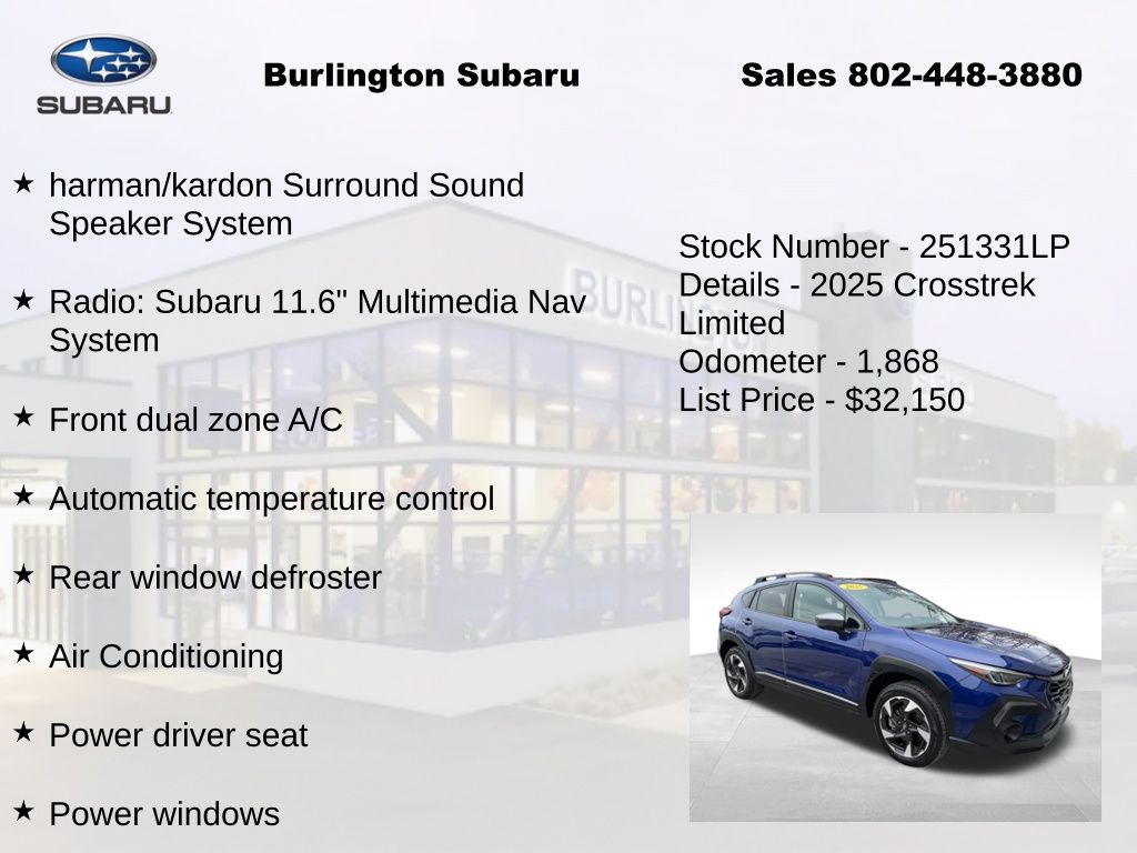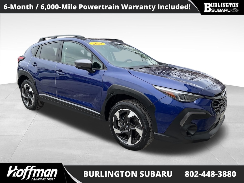 Clean CARFAX. Subaru Crosstrek Limited 2025 4-Wheel Disc Brakes, ABS brakes, Air Conditioning, Alloy wheels, Anti-whiplash front head restraints, Auto High-beam Headlights, Auto-Dimming Exterior Mirror w/Approach Light, Auto-Dimming Mirror w/Compass & HomeLink, Automatic temperature control, Brake assist, Crosstrek Mirror Package, Driver vanity mirror, Dual front impact airbags, Dual front side impact airbags, Electronic Stability Control, Emergency communication system, Exterior Parking Camera Rear, Four wheel independent suspension, Front dual zone A/C, Front fog lights, Front reading lights, Fully automatic headlights, H/K Speaker System & Power Moonroof & Navigation, harman/kardon Surround Sound Speaker System, Heated door mirrors, Heated Front Bucket Seats, Illuminated entry, Knee airbag, Leather Shift Knob, Leather steering wheel, Leather-Trimmed Upholstery, Low tire pressure warning, Occupant sensing airbag, Outside temperature display, Overhead airbag, Panic alarm, Passenger vanity mirror, Power door mirrors, Power driver seat, Power Moonroof, Power steering, Power windows, Radio: Subaru 11.6" Multimedia Nav System, Rear window defroster, Rear window wiper, Remote keyless entry, Speed control, Speed-sensing steering, Split folding rear seat, Steering wheel mounted audio controls, Tachometer, Telescoping steering wheel, Tilt steering wheel, Traction control, Trip computer, Turn signal indicator mirrors, Variably intermittent wipers. Odometer is 4187 miles below market average!