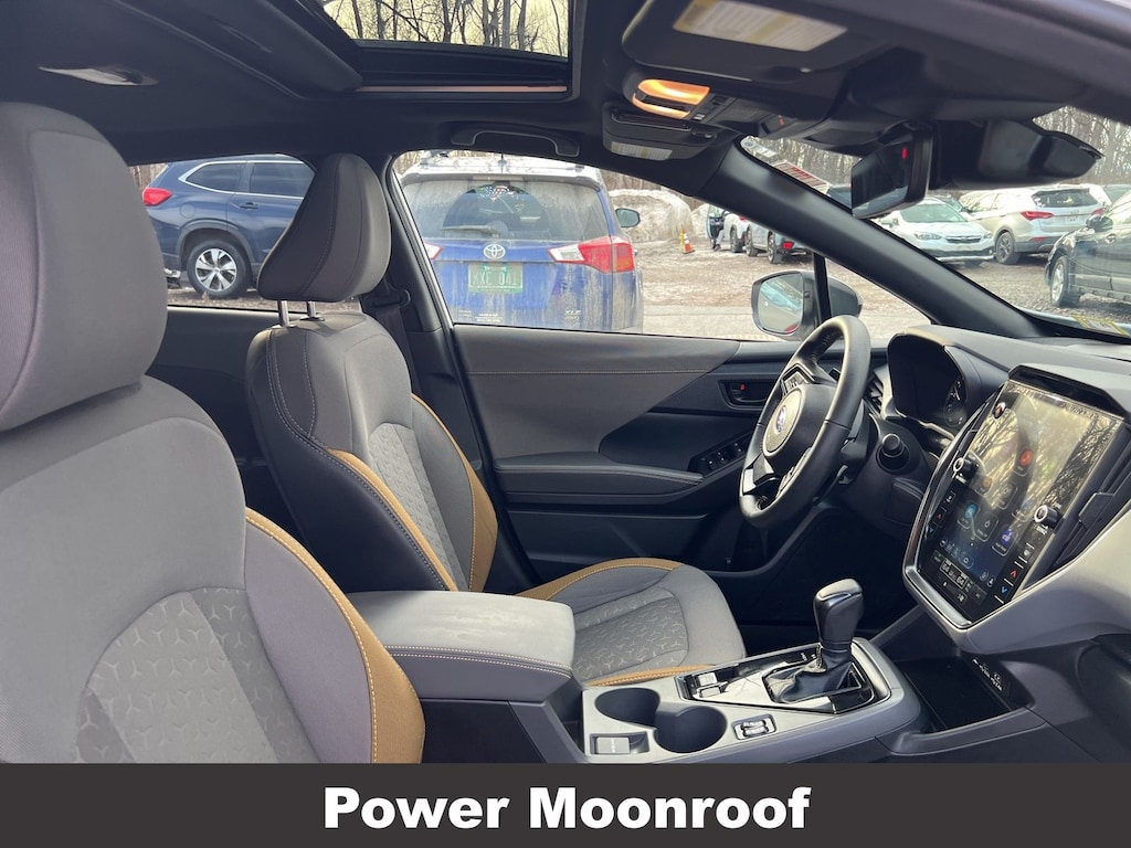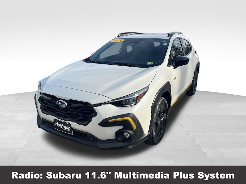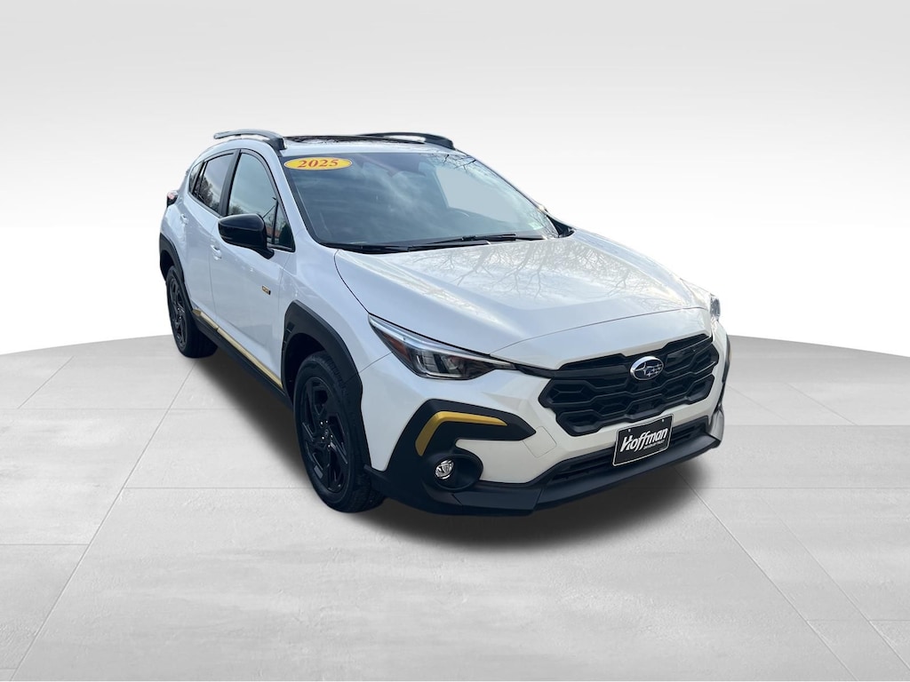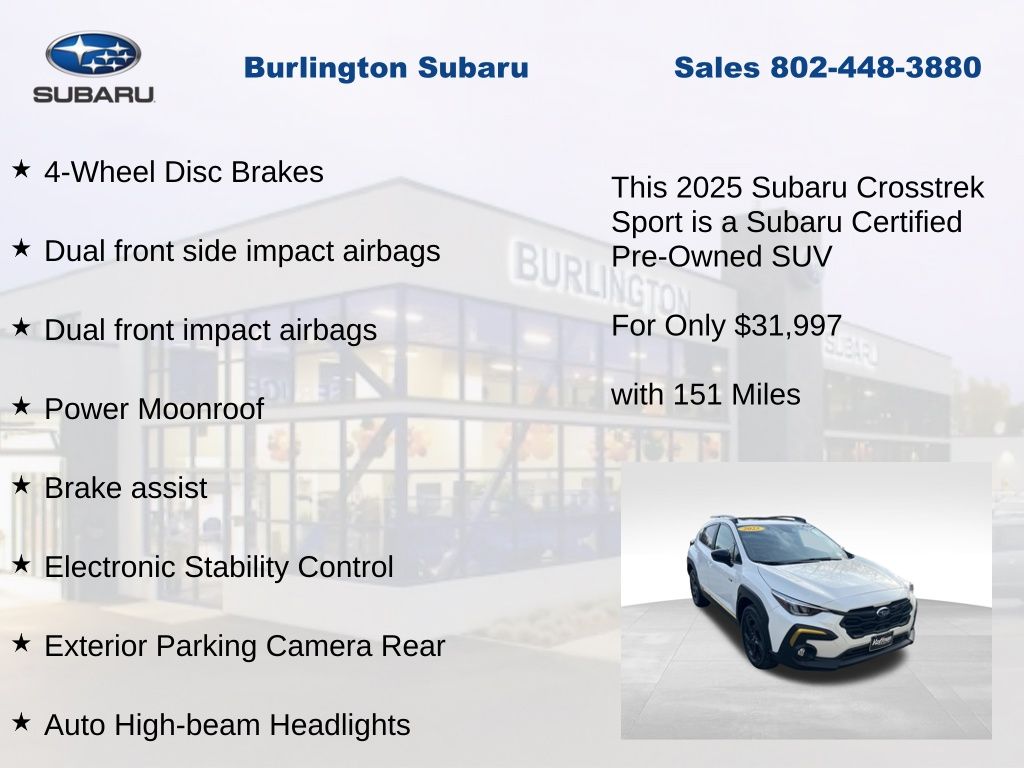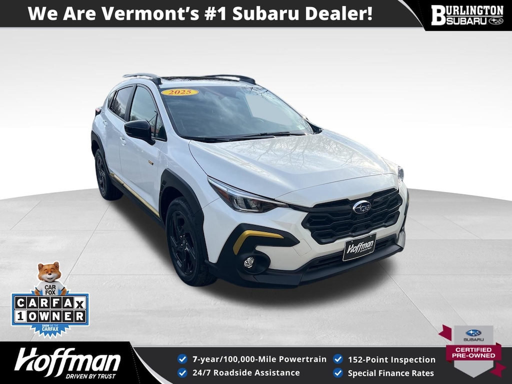CARFAX One-Owner. Clean CARFAX. Subaru Crosstrek Sport 2025 Certified. 10-Way Power Driver's Seat, 4-Wheel Disc Brakes, ABS brakes, Air Conditioning, Alloy wheels, Anti-whiplash front head restraints, Auto High-beam Headlights, Automatic temperature control, Blind Spot Detection (BSD), Brake assist, BSD/RCTA & Power Driver Seat & Power Moonroof, Driver vanity mirror, Dual front impact airbags, Dual front side impact airbags, Electronic Stability Control, Emergency communication system, Exterior Parking Camera Rear, Four wheel independent suspension, Front dual zone A/C, Front fog lights, Front reading lights, Fully automatic headlights, Heated door mirrors, Heated Front Bucket Seats, Illuminated entry, Knee airbag, Leather Shift Knob, Leather steering wheel, Low tire pressure warning, Occupant sensing airbag, Outside temperature display, Overhead airbag, Panic alarm, Passenger vanity mirror, Power door mirrors, Power Moonroof, Power steering, Power windows, Radio: Subaru 11.6" Multimedia Plus System, Rear Cross-Traffic Alert (RCTA) System, Rear window defroster, Rear window wiper, Remote keyless entry, Speed control, Speed-sensing steering, Split folding rear seat, Steering wheel mounted audio controls, Tachometer, Telescoping steering wheel, Tilt steering wheel, Traction control, Trip computer, Turn signal indicator mirrors, Variably intermittent wipers. Odometer is 3919 miles below market average!