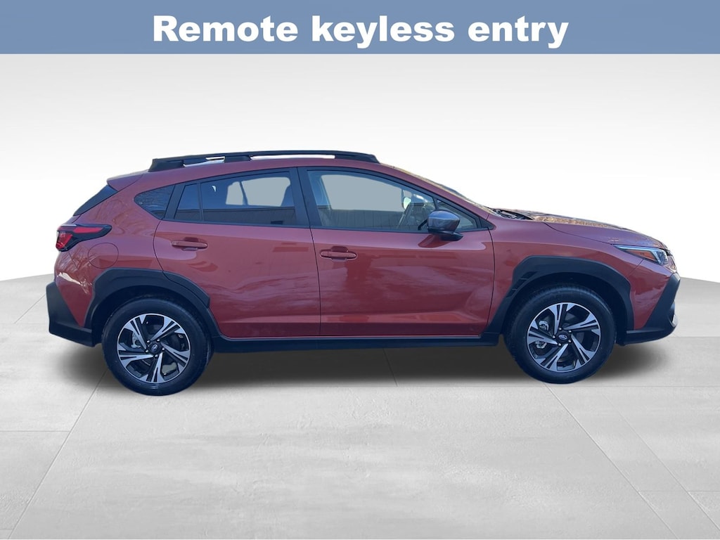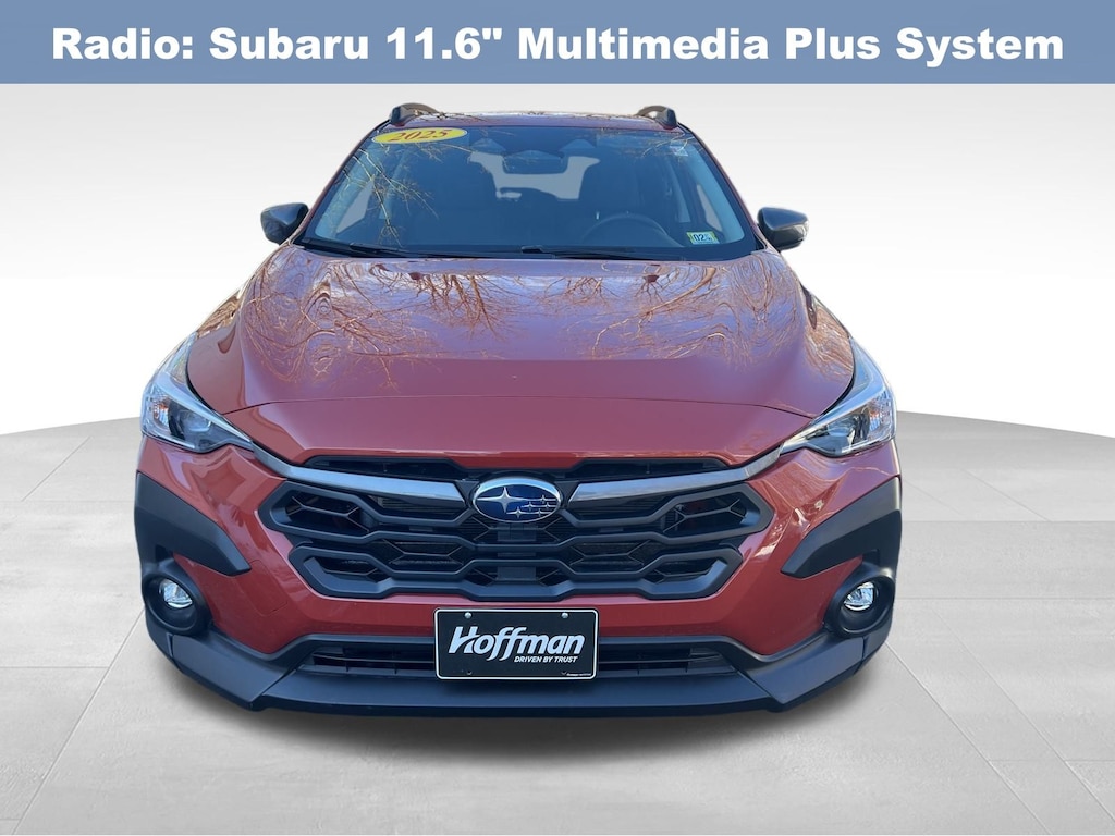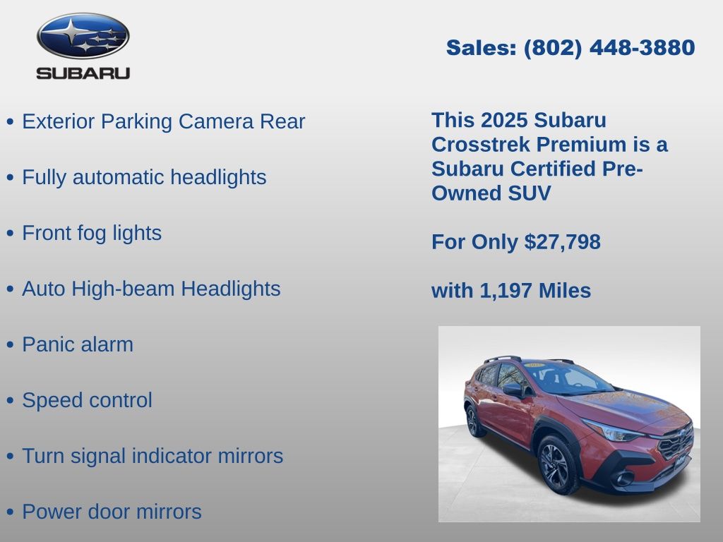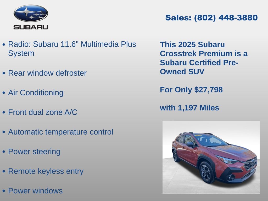 CARFAX One-Owner. Clean CARFAX. Subaru Crosstrek Premium 2025 Certified. 4-Wheel Disc Brakes, ABS brakes, Air Conditioning, Alloy wheels, Anti-whiplash front head restraints, Auto High-beam Headlights, Automatic temperature control, Brake assist, Driver vanity mirror, Dual front impact airbags, Dual front side impact airbags, Electronic Stability Control, Emergency communication system, Exterior Parking Camera Rear, Four wheel independent suspension, Front Bucket Seats, Front dual zone A/C, Front fog lights, Front reading lights, Fully automatic headlights, Illuminated entry, Knee airbag, Low tire pressure warning, Occupant sensing airbag, Outside temperature display, Overhead airbag, Overhead console, Panic alarm, Passenger vanity mirror, Power door mirrors, Power steering, Power windows, Radio: Subaru 11.6" Multimedia Plus System, Rear window defroster, Rear window wiper, Remote keyless entry, Speed control, Speed-sensing steering, Split folding rear seat, Steering wheel mounted audio controls, Tachometer, Telescoping steering wheel, Tilt steering wheel, Traction control, Trip computer, Turn signal indicator mirrors, Variably intermittent wipers. Odometer is 3545 miles below market average!