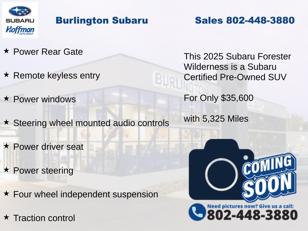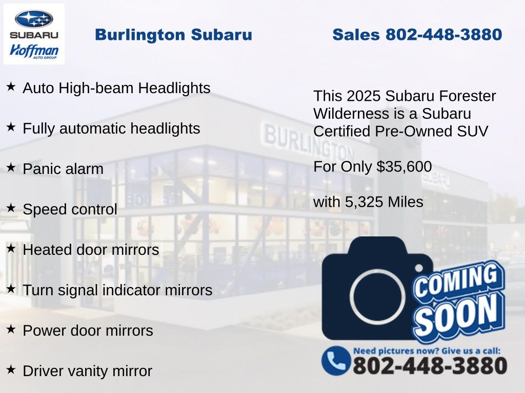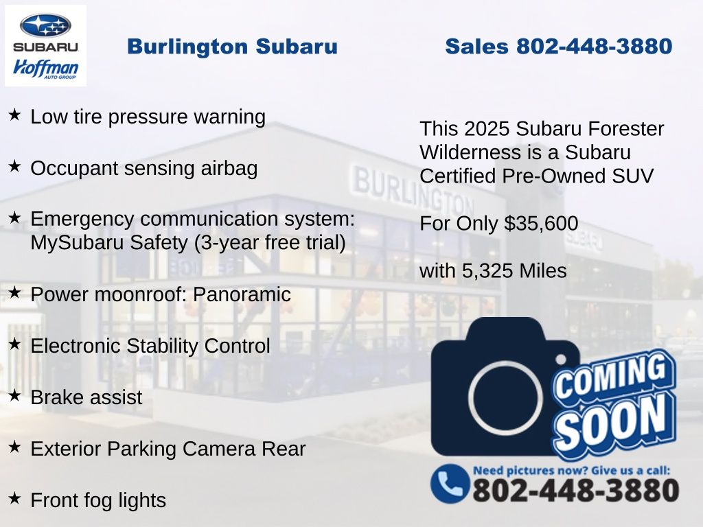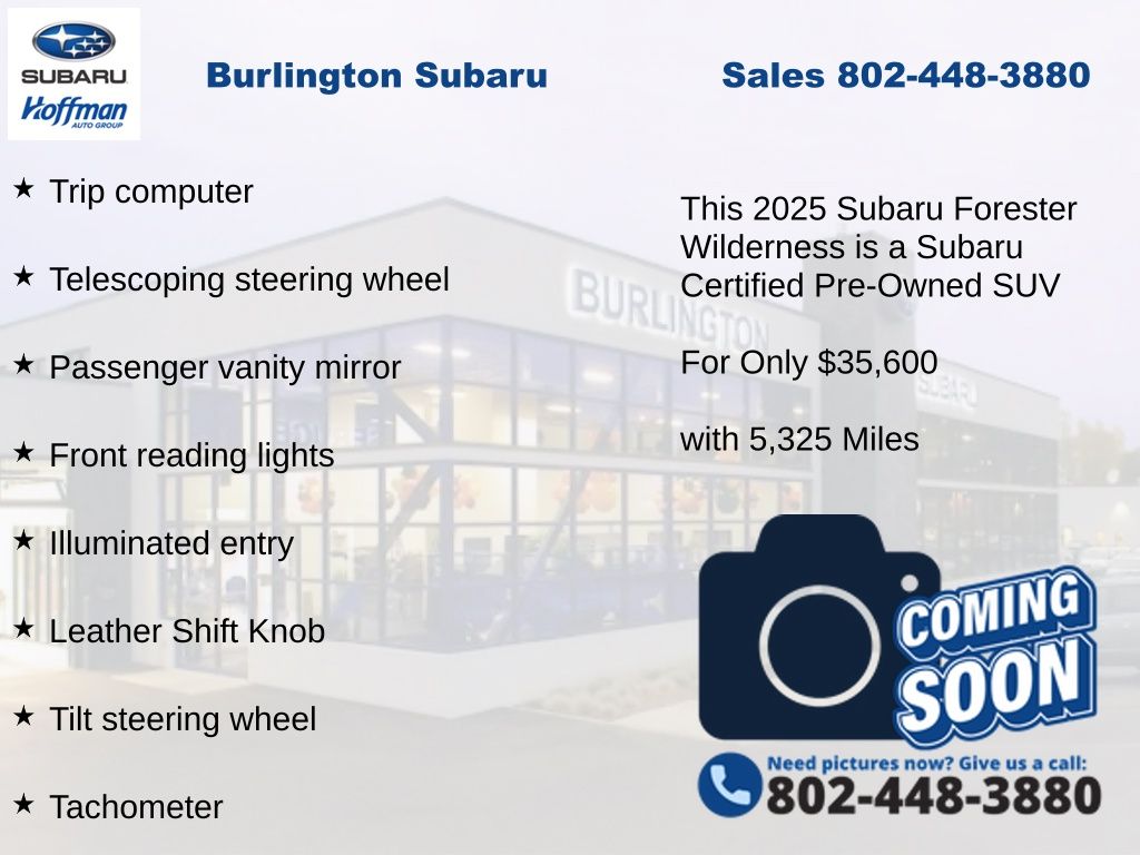 CARFAX One-Owner. Clean CARFAX. Subaru Forester Wilderness 2025 Certified. 4-Wheel Disc Brakes, ABS brakes, Air Conditioning, Alloy wheels, Anti-whiplash front head restraints, Auto High-beam Headlights, Automatic temperature control, Brake assist, Driver vanity mirror, Dual front impact airbags, Dual front side impact airbags, Electronic Stability Control, Emergency communication system: MySubaru Safety (3-year free trial), Exterior Parking Camera Rear, Four wheel independent suspension, Front dual zone A/C, Front fog lights, Front reading lights, Fully automatic headlights, harman/kardon Audio & Power Rear Gate, Heated door mirrors, Heated Front Bucket Seats, Illuminated entry, Knee airbag, Leather Shift Knob, Leather steering wheel, Low tire pressure warning, Occupant sensing airbag, Outside temperature display, Overhead airbag, Panic alarm, Passenger vanity mirror, Power door mirrors, Power driver seat, Power moonroof: Panoramic, Power Rear Gate, Power steering, Power windows, Radio: Subaru 8.0" Multimedia Navigation System, Rear window defroster, Rear window wiper, Remote keyless entry, Speed control, Speed-sensing steering, Split folding rear seat, Steering wheel mounted audio controls, Tachometer, Telescoping steering wheel, Textured StarTex Upholstery, Tilt steering wheel, Traction control, Trip computer, Turn signal indicator mirrors, Variably intermittent wipers.