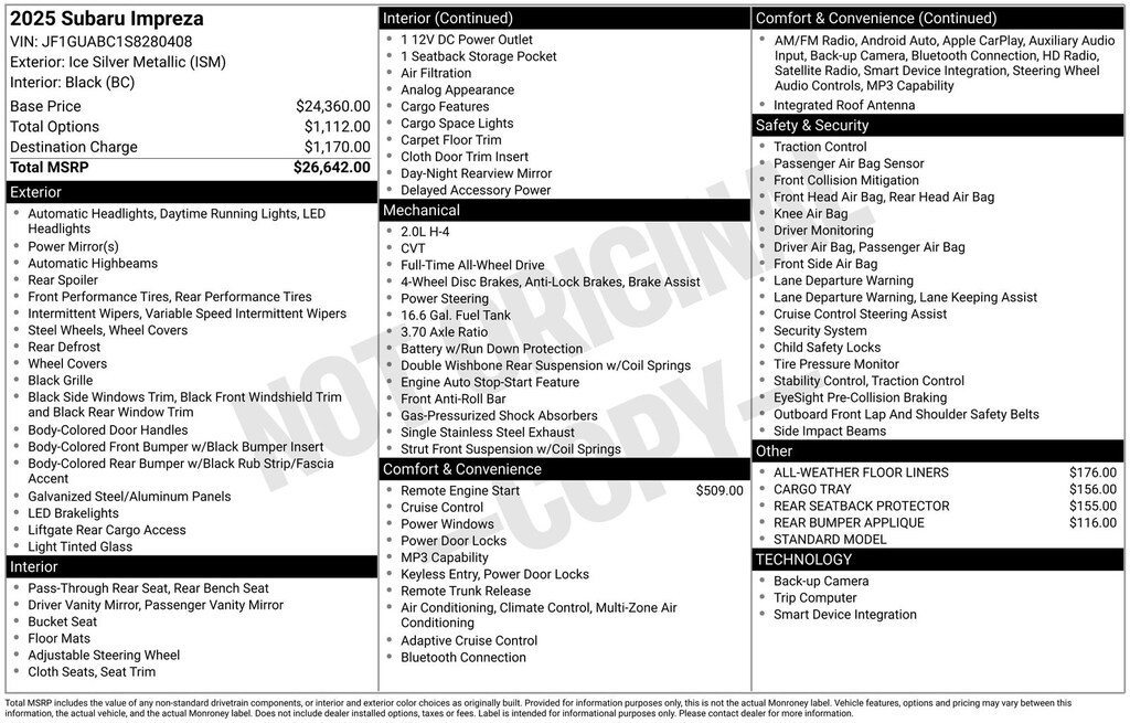 - Forward collision: EyeSight Pre-Collision Braking mitigation