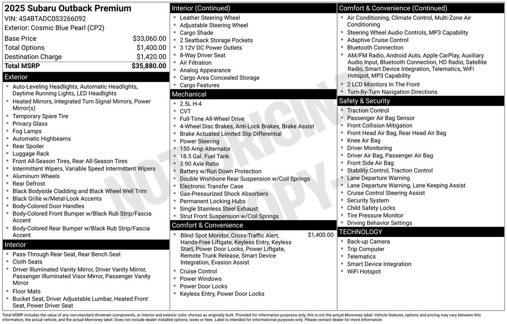 - Adaptive Cruise Control: EyeSight Advanced Adaptive Cruise Control